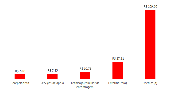 As estatísticas recentes dos profissionais de saúde contaminados pela Covid-19 são assustadoras. Segundo dados do Conselho Federal de Enfermagem (COFEN), até 17 de abril de 2020 somavam-se 4 mil profissionais afastados pela doença, sendo 552 deles com diagnóstico confirmado (14%) e mais de 3,5 mil suspeitos. Até o dia 10 de abril foram notificadas 16 mortes decorrentes da Covid-19 em profissionais de enfermagem que, como reflexo da maior participação feminina nesse tipo de atividade, eram em sua maioria mulheres. Além disso, metade delas tinha pelo menos 40 anos. Em uma semana houve aumento de 87,5% dos óbitos, que atingiram a marca de 30 mortes. Esses dados escancaram o risco ao qual esses profissionais estão submetidos. Ainda segundo o COFEN, até 17 de abril de 2020 já havia mais de 4 mil denúncias de falta de equipamentos de proteção individual no país todo. Além das diferenças na composição por sexo (Figura 1), nota-se diferenciais expressivos entre os salários pagos nessas categorias. Pelo Gráfico 1 podemos perceber a significativa distância dos salários dos médicos em relação aos demais trabalhadores. Enquanto os médicos percebem a remuneração de R$109,66 por hora de trabalho, os enfermeiros recebem R$27,11, os técnicos/auxiliares de enfermagem recebem R$10,73, os ocupados nos serviços de apoio recebem R$7,85 e os recepcionistas recebem R$7,18. A hora de trabalho de médicos é remunerada em valores 15 vezes maiores do que de profissionais com as piores remunerações.