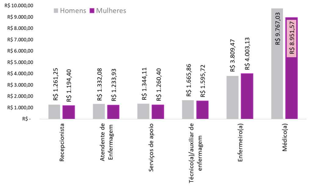 As mulheres são maioria nas ocupações da área de enfermagem, recepção e apoio. Áreas que no setor de saúde são as mais precarizadas, pois estão associadas às atividades de cuidado aos usuários dos serviços de saúde, limpeza, transporte dos pacientes, organização do fluxo de atendimento, entre outras. Ademais, os profissionais de enfermagem constituem a maior força de trabalho em saúde e, no entanto, são historicamente desvalorizados com baixos salários e alta carga horária de trabalho.