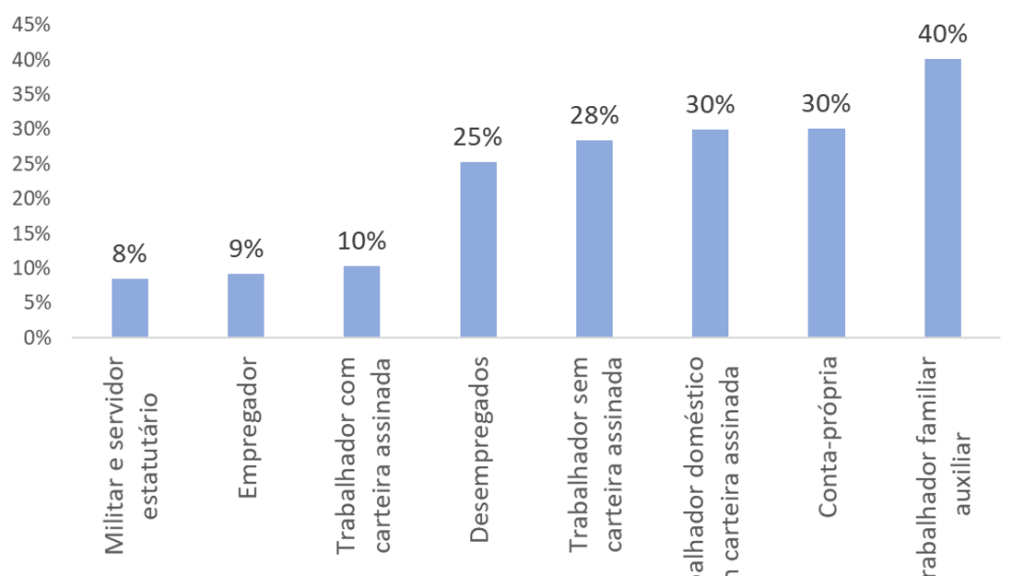 O acesso à internet está intimamente ligado ao nível de renda das famílias, que, por sua vez, é fortemente determinado pela ocupação dos adultos que as compõem. No Gráfico 1 é apresentado o percentual de adultos sem acesso à internet em casa segundo o tipo de ocupação que possuem. Quando analisamos os militares, servidores públicos, empregadores e trabalhadores com carteira assinada, notamos que o percentual deles em casas sem internet é mínimo, apenas 10%, frente às demais formas de trabalho ou falta de trabalho. Entre os adultos desempregados no Nordeste, 25% não tinham acesso à Internet em casa. Trabalhadores sem carteira assinada, por conta própria ou auxiliando suas famílias são também atingidos pela falta de acesso à Internet em casa. Os que atuam como auxiliares junto a suas famílias são os que se encontram, do ponto de visto de acesso ao benefício, em pior condição: 4 a cada 10 não teriam internet em casa para fazer a solicitação.