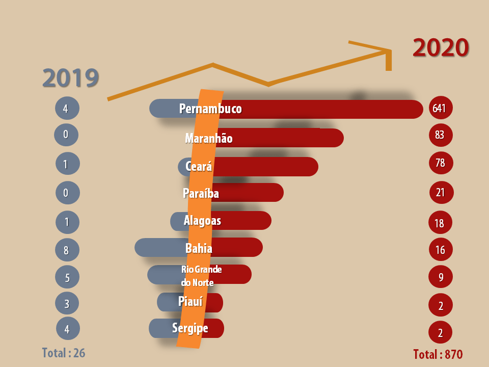 Em relação aos óbitos, com base nos dados do Registro Civil, o número de mortes por Síndrome Respiratória Aguda Grave (SRAG) no Nordeste aumentou em mais de 32 vezes em abril deste ano comparativamente ao mesmo mês de 2019. Para o Brasil, no mesmo período o aumento foi de 15 vezes. De acordo com esses dados (ver Figura 1), em abril deste ano os cartórios registraram 870 óbitos por SRAG na região Nordeste, contra apenas 26 no mesmo mês de 2019. No mesmo período, contabilizava-se 989 mortes com suspeita ou confirmadas pela Covid-19. Entre os estados com maior crescimento no número de mortes por SRAG, Pernambuco foi o que registrou mais casos de mortes por Covid-19 no Nordeste. Apresentou uma variação de cerca de 159 vezes no número de óbitos em abril comparativamente o mesmo mês do ano anterior. O segundo estado mais afetado foi o Maranhão com 83 vezes mais mortes por SRAG na comparação do mesmo período.