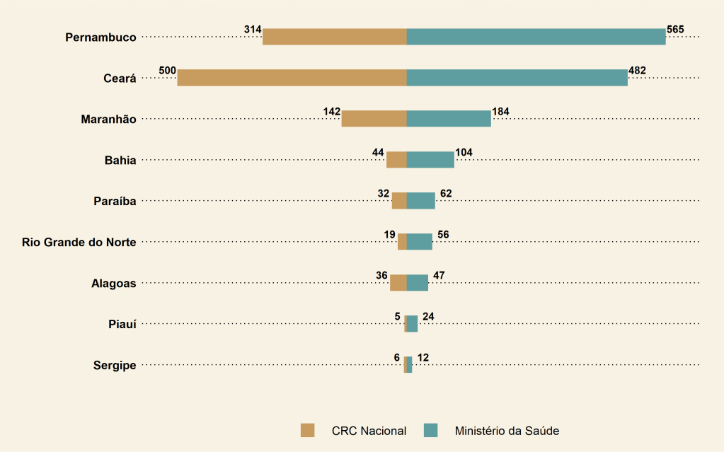Para o Brasil como um todo, tem-se observado que o número de óbitos confirmados ou suspeitos por Covid-19 registrados pelos Cartórios de Registro Civil é mais elevado em relação aos dados oficiais do Ministério da Saúde. Entretanto, na região Nordeste observa-se um cenário diferente (Figura 2). Até o dia 30 de abril, os cartórios contabilizaram 488 mortes a menos por Covid-19 do que as notificadas oficialmente pelo Ministério da Saúde no Painel Coronavírus Brasil. Os números do CRC Nacional apontam 1.048 mortes registradas como Covid-19 na região, enquanto os dados do Ministério da Saúde contabilizavam 1.536 casos fatais confirmados, uma diferença de 46,6%. No estado do Pernambuco, que registra o maior número de casos fatais na região, os dados apontam um diferencial de 80% entre as duas fontes de dados. O Ceará figura como único estado da região com maior número de óbitos registados pelos cartórios (500 mortes) comparativamente aos dados do Ministério da Saúde (482 mortes). Nesse caso, os dados do CRC são 3,7% mais alto. Sempre considerando os registros para o mês de abril.