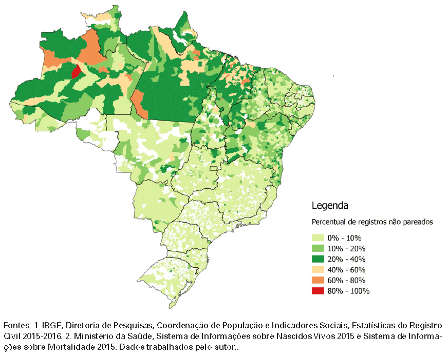 Um estudo recente desenvolvido pelo IBGE mostra que há uma boa eficiência nos sistemas de coleta e qualidade de dados do Ministério da Saúde e do Registro Civil. O estudo pareou os dados dessas duas bases e verificou uma coincidência dos registros das duas bases para mais de 90% dos registros. Em um país com dimensões continentais e desigualdades regionais enormes de, por exemplo, acesso à internet, esse dado chega a ser surpreendente. É verdade que existem lacunas em algumas regiões, como podemos ver na Figura 3, e este estudo desenvolvido pelo IBGE contribui para que esforços sejam feitos de maneira focalizada sobre essas localidades para atingir um nível maior ainda na qualidade da informação de óbitos no Brasil.