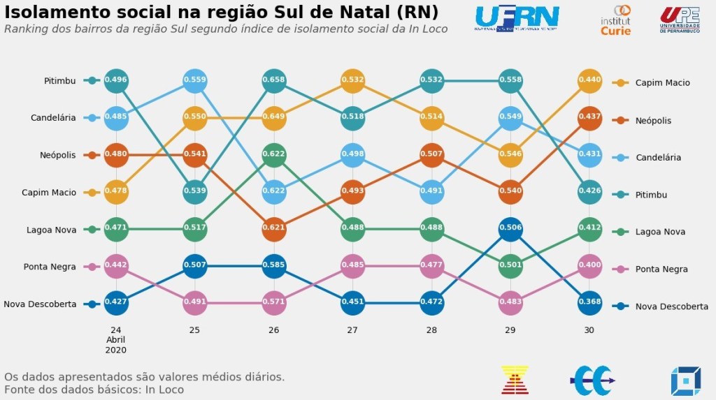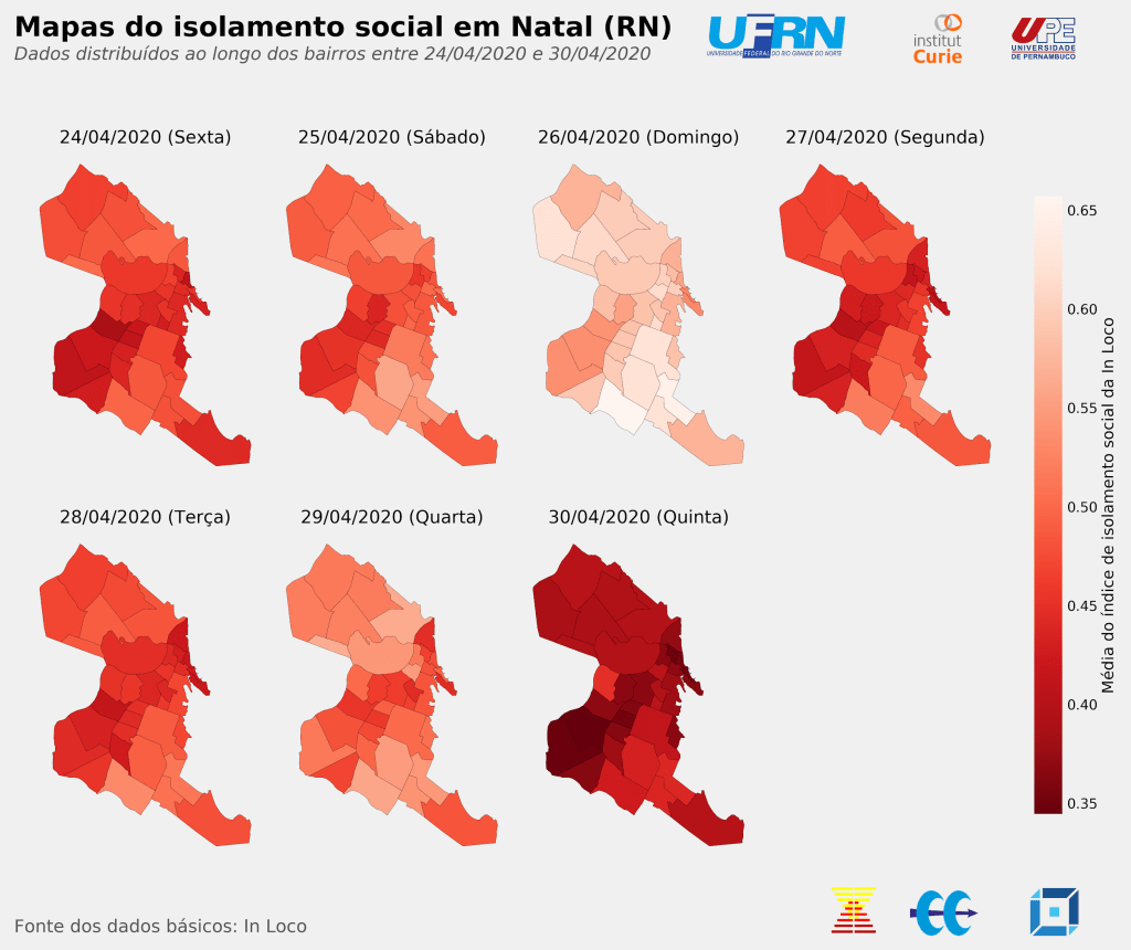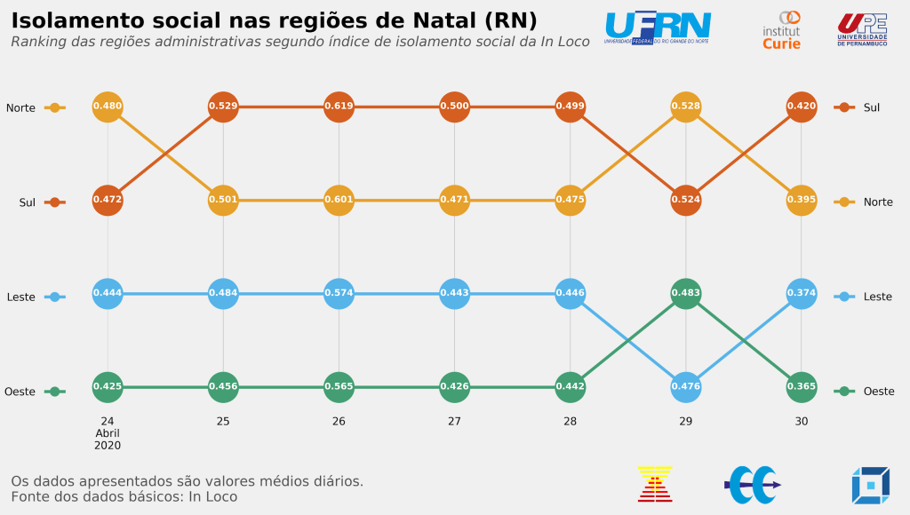 Com base no indicador de isolamento social disponibilizado pela In Loco, foi possível realizar uma análise diária para Natal, Regiões Administrativas e bairros para este município. Informações em nível intramunicipal, conforme as utilizadas nesta nota, revelam que há uma importante variabilidade interna ao cumprimento das medidas de distanciamento social e que deve ser considerada para o sucesso das políticas de combate ao avanço da doença.