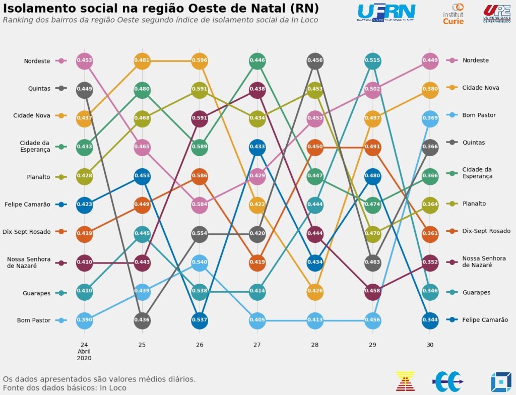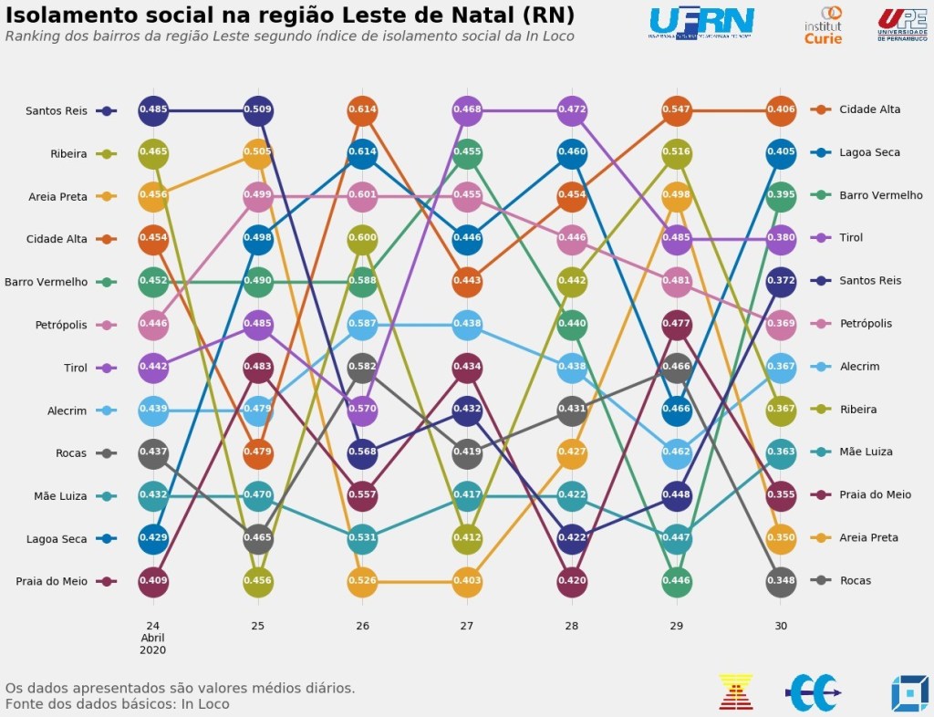 Assim como o observado para os bairros da Região Administrativa Norte, houve grande oscilação entre os bairros da região Leste no que se refere ao alcance de valores no índice de isolamento social. Santos Reis apresentou os maiores valores nos dois primeiros pontos no tempo, mas terminou a série analisada na quinta posição, com um nível de distanciamento social de 37,2% em 30/04. Nessa data, Praia do Meio (35,5%), Areia Preta (35%) e Rocas (34,8%) foram os últimos colocados, e Cidade Alta (40,6%), Lagoa Seca (40,5%) e Barro Vermelho (39,5%) apresentaram os maiores níveis de distanciamento social.