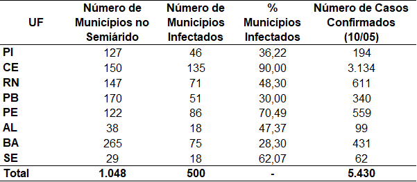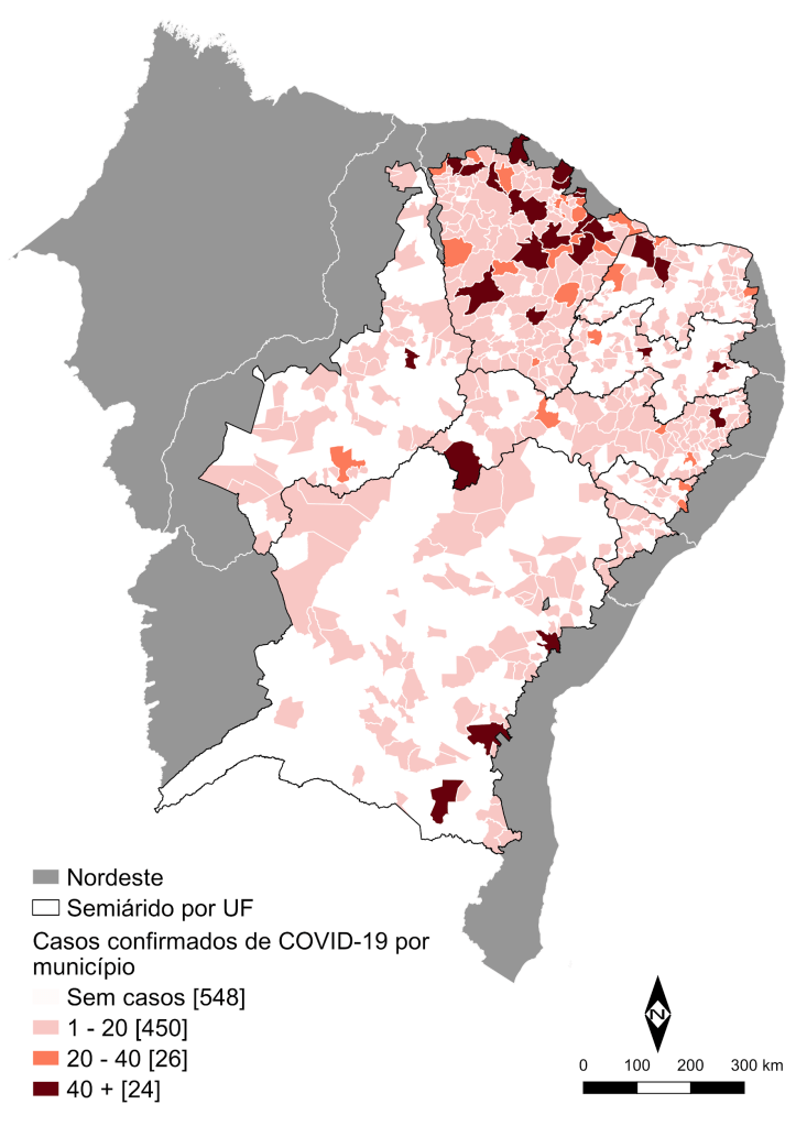 Considerando tanto o número de municípios dessa região infectados em cada estado quanto o número de casos confirmados, destaca-se o estado do Ceará com 135 municípios com casos confirmados, somando um total de 3.134 casos totais nestes municípios (Tabela 1). Aproximadamente 90% dos municípios do semiárido cearense já possuem casos confirmados de Covid-19. Em seguida vem o estado de Pernambuco e Sergipe com maior propagação do vírus com 70,5% e 62%, respectivamente. Em termos do número total de casos confirmados na porção semiárida destes estados, depois do estado do Ceará, vem o Rio Grande do Norte, com 611 casos. Apesar disso, possui uma menor disseminação espacial, pois apenas 48,3% dos municípios da região semiárida do RN confirmaram casos, indicando que os mesmos ainda estão concentrados em menos municípios.