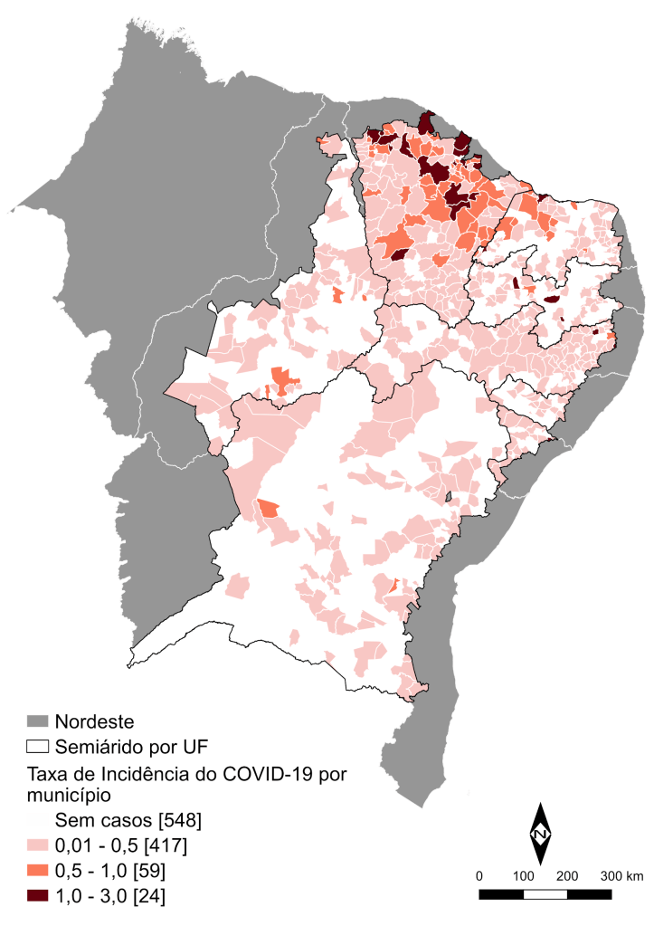 No semiárido do estado do Ceará é onde se destaca o maior número de casos, especialmente nos municípios mais próximos à capital cearense (Fortaleza), como o município de Caucaia que já registra 653 casos de Covid-19. Mais ao interior destacam-se os municípios de Sobral (261) e Quixadá (91). No semiárido do estado do Rio Grande do Norte o destaque fica por conta de Mossoró com 281 e Açu com 49 casos confirmados. Campina Grande e Patos na Paraíba também se destacam com 100 e 74 casos, respectivamente. Além desses, destacam-se os municípios de Feira de Santana (Bahia) e Caruaru (Pernambuco), com 112 e 53 casos, respectivamente. Por fim, o município de Picos no Piauí com 57 casos. Por outro lado, quando se verifica a incidência do Covid-19 por 1.000 habitantes é possível perceber que os casos se concentram no semiárido do estado cearense e na porção oeste do Rio Grande do Norte (Figura 2), confirmando uma relação de dinâmicas socioeconômicas e demográficas entre os dois estados.