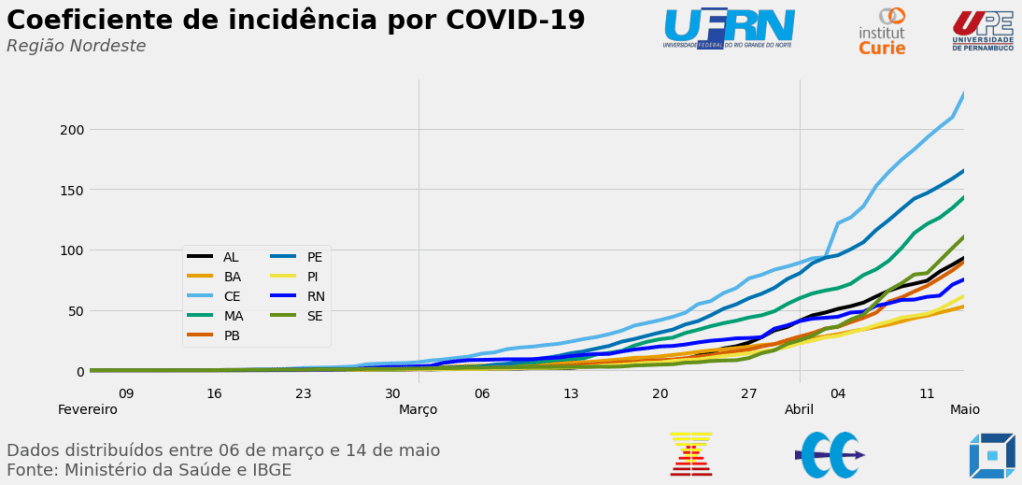 No Brasil, o primeiro estado a decretar medidas de lockdown foi o Maranhão. Por meio de decisão proferida em 30 de abril de 2020, o Poder Judiciário concordou com o pedido do Ministério Público estadual (MP-MA) e determinou o confinamento em quatro municípios maranhenses: São Luís, São José de Ribamar, Paço do Lumiar e Raposa. Este confinamento teve início em 5 de maio, inicialmente previsto para durar 10 dias. As medidas restritivas para essas localidades incluem ações como a proibição da circulação de veículos particulares, exceto para compra de alimentos, medicamentos, ou transporte de pessoas que necessitassem de atendimento de saúde. Conforme a Figura 1, o número de casos de coronavírus por 100 mil habitantes (coeficiente de incidência) no estado do Maranhão tem crescido rápido no tempo. Em 14/05, o Maranhão apresentava o terceiro maior coeficiente de incidência da Região Nordeste (138,5 casos por 100 mil habitantes), perdendo apenas para os estados de Pernambuco (163,1 casos por 100 mil habitantes) e Ceará (230,8 casos por 100 mil habitantes).