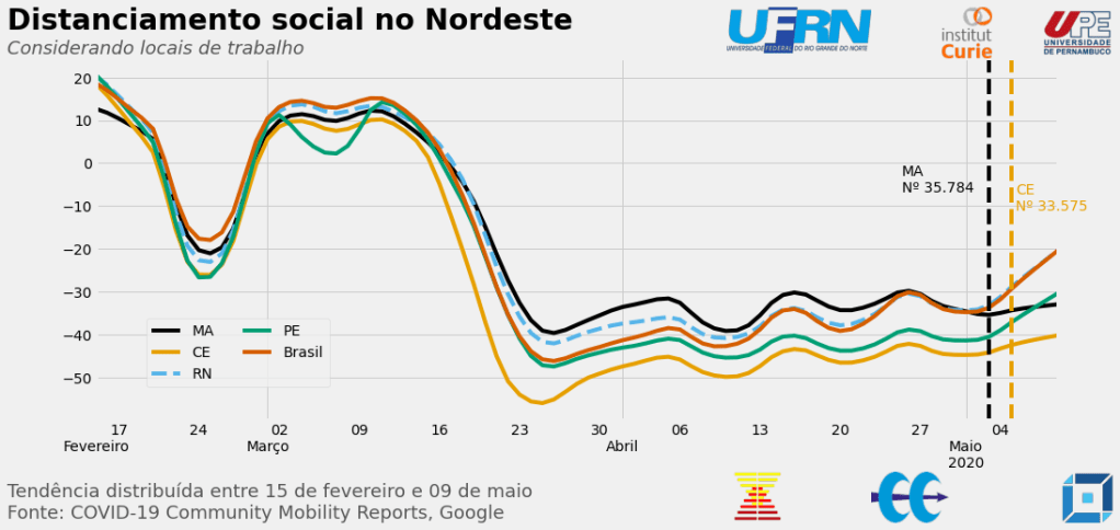 Para o Ceará, cuja medida de lockdown  passou a vigorar em 8 de maio, portanto apenas um dia antes do último ponto no tempo considerado nas análises dos dados da Google, o nível de circulação de pessoas em locais de trabalho já era o mais baixo entre todas as unidades da federação consideradas. Nesse estado, o nível de contágio da doença que já atinge a maior marca da Região Nordeste, possivelmente contribuiu para um maior cumprimento da população às medidas de distanciamento social, ao menos no que se refere a esse quesito.