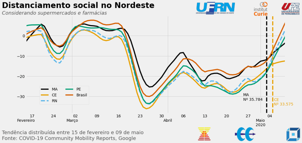 No que se refere à tendência de mobilidade considerando supermercados e farmácias, observa-se tendências opostas para os dois estados cujas medidas de lockdown entraram em vigor no período de análise considerado: para o Maranhão, que adotou o confinamento em quatro municípios da Região Metropolitana de São Luiz, entre elas a própria capital, a tendência pós decreto de lockdown (a medida judicial autorizando o decreto data de 30 de abril)foi de aumento, enquanto no Ceará, que adotou essa medida mais rígida de distanciamento social apenas em Fortaleza e anunciou esses decretos em  5 de maio, a tendência foi de redução. Porém, conforme anteriormente mencionado, no caso do Ceará as medidas e lockdown passaram a vigorar efetivamente a partir de 8 de maio, ou seja, em relação ao estado do Maranhão o período de exposição a essas medidas foi menor. Para a média brasileira e para os demais estados, entre eles o RN, a tendência ao final do período foi de um claro aumento na mobilidade (Figura 5).