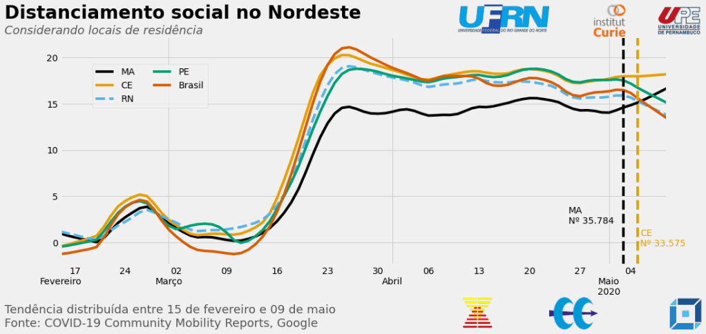 É possível que uma tendência declinante não tenha sido alcançada pelo fato de que uma parcela importante de sua população apresente vínculos empregatícios informais, o que dificulta a manutenção das pessoas em suas casas. Nesses casos, é necessário que políticas de assistência social, como o auxílio emergencial à população de baixa renda, sejam implementadas para conter a circulação de pessoas. Todavia, análises futuras incluindo uma maior série temporal podem ser úteis para verificar como essas tendências apresentadas pelo estado maranhense se comportam no tempo. Para os estados do Ceará e de Pernambuco, análises com novos dados da Google poderão descrever melhor o quão as medidas de endurecimento do distanciamento social obtiveram sucesso na adesão da população.