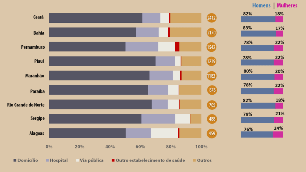 Segundo os dados do Sistema de Informações sobre Mortalidade (SIM) do Ministério da Saúde, entre os anos de 2015 e 2018, registrou-se no Nordeste 11.056 mortes por suicídio. Mas uma informação relevante e que converge com as medidas de distanciamento social necessárias para o combate à pandemia da Covid-19 é o fato de que a maior parte destes suicídios ocorrem dentro do domicílio. Considerando-se os diferenciais por sexo para as pessoas com mais de 15 anos de idade a maior parcela dos óbitos foi de homens, com uma variação entre 78% e 83% entre as Unidades da Federação (ver Figura 1).
