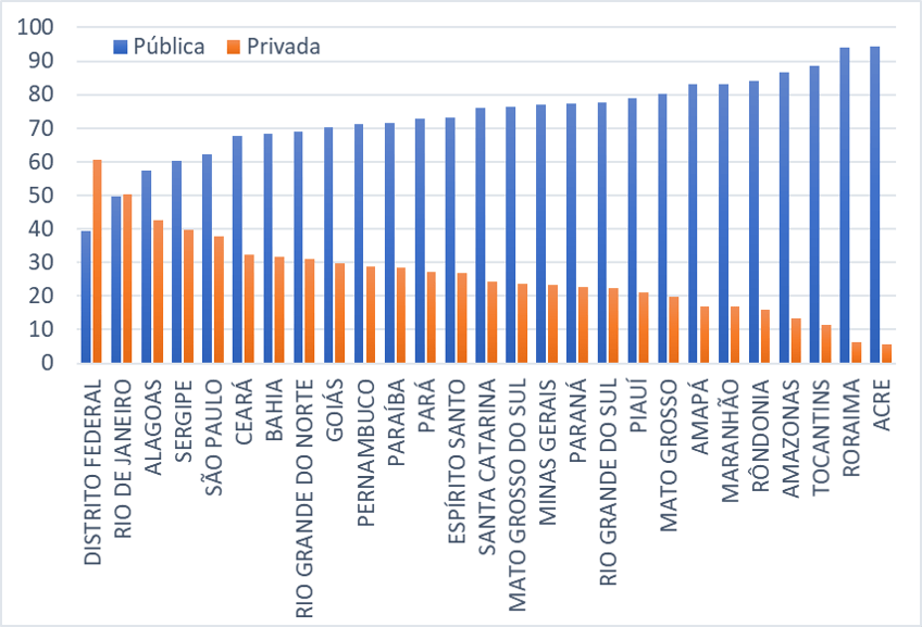 Gráfico 1 – Brasil. Distribuição percentual dos estabelecimentos de ensino segundo tipo de dependência (pública ou privada) por Unidade da Federação. 2019. Fonte: Microdados do Censo Escolar do INEP (2019). Tabulação própria.