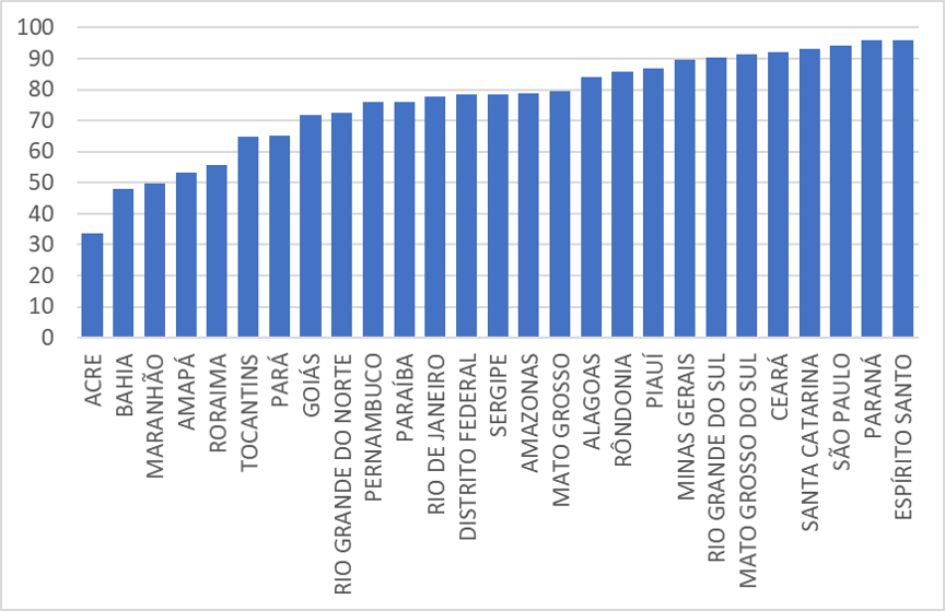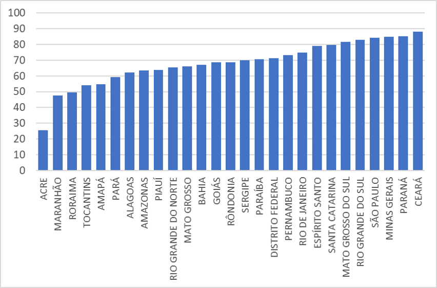 Outro equipamento indispensável para o bom desempenho escolar dos jovens estudantes é o computador (seja de mesa ou portátil). Nos dias de hoje, a combinação do uso desses equipamentos, laboratório de informática e acesso à internet é essencial para o sucesso escolar e, consequentemente, para uma melhor classificação do aluno no Enem. De acordo com o Gráfico 3, menos de 50% dos alunos no Acre, na Bahia e no Maranhão têm acesso a esse recurso nas escolas onde estudam. Em contrapartida, Espírito Santo, Paraná, São Paulo, Santa Catarina e Ceará se destacam nesse quesito, pois oferecem acesso a computador de mesa, laptop ou tablet em mais de 92% de suas escolas. Em grande medida, esta infraestrutura poderia servir como ferramenta de apoio de fundamental importância para superar, ao menos em parte, a carência que os estudantes menos favorecidos possam ter em relação a disponibilidade de computadores em suas residências. Entretanto, como podemos perceber, grande parcela desses estudantes não seria beneficiada em função da baixa capacidade de muitas escolas em oferecer tais equipamentos.