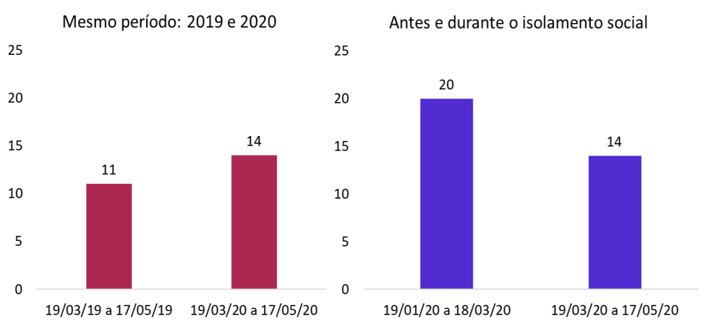 Embora o número de casos classificados como feminicídios durante o isolamento tenha sido menor, analisando as informações detalhadas, verifica-se que novas causas atingiram as mulheres: vítimas de intervenção policial e de lesão seguida de morte. Durante o isolamento social, a circulação de pessoas diminui e as vias públicas passam também a ser locais de perigo para as mulheres. Nesse período, prevaleceram as mortes violentas de mulheres no período da noite e em vias públicas. As mortes por arma de fogo durante o isolamento foram maioria (13 das 14 mortes).