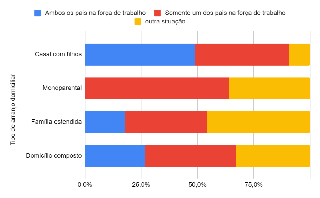 Alguns tipos de arranjos domiciliares poderão ter condições de lidar com essa situação, como por exemplo: casais com filhos, cujo um dos cônjuges não trabalha fora do domicílio; e domicílios estendidos, em que muitas vezes o avô ou avó moram junto com os filhos e netos. No entanto, outros tipos de arranjos domiciliares certamente não terão a mesma facilidade, como é o caso dos domicílios monoparentais (que são aqueles compostos apenas por um dos pais (pai ou mãe) e seus filhos). O gráfico 2 apresenta a distribuição das crianças que frequentam a escola por tipo de arranjo domiciliar onde viviam em 2018. De todas as crianças de 5 a 14 anos frequentando a escola, 57,9% vivem em arranjos formados por crianças e seus pais, portanto, o caso mais comum. Em seguida, estão os arranjos com famílias estendidas, que contam com familiares como avós, tios, primos e outros parentes, podendo ou não ter ambos os pais, simultaneamente, onde vivem 26,5% das crianças. Nos arranjos monoparentais, ou seja, arranjos em que há apenas mãe ou pai, estão 14,5% das crianças que frequentam a escola. Entretanto, os arranjos monoparentais com crianças na escola são marcadamente representados por mães com seus filhos, que são 93% dos casos.