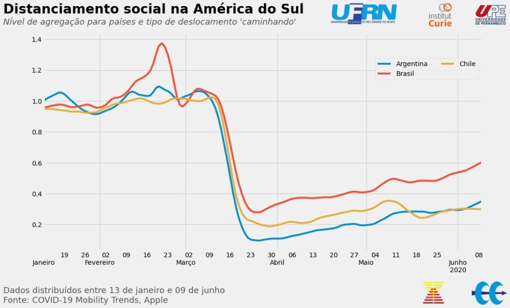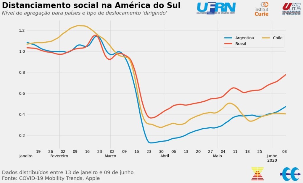 A Figura 1 apresenta a tendência de deslocamentos na modalidade ‘dirigindo’ para o Brasil em comparação à Argentina e ao Chile do dia 13 de janeiro a 09 de junho. Para ambos os países, a redução na circulação ocorre aproximadamente após a segunda quinzena de março quando foram anunciados decretos de distanciamento social no Brasil e no Chile, e de lockdown na Argentina. No caso do Brasil, que representa um país de maior território e com medidas de distanciamento social menos rígidas sobretudo em comparação com a Argentina, verificou-se um nível de circulação de pessoas dirigindo bem superior. No caso do Chile, a redução na tendência observada em maio pode ser uma decorrência do anúncio de lockdown na região metropolitana de Santiago no dia 15 daquele como uma tentativa de conter o número crescente de casos de COVID-19 naquele país. Analisando a tendência de deslocamentos na modalidade ‘caminhando’, o mesmo padrão de mobilidade para os três países analisados se confirmou.