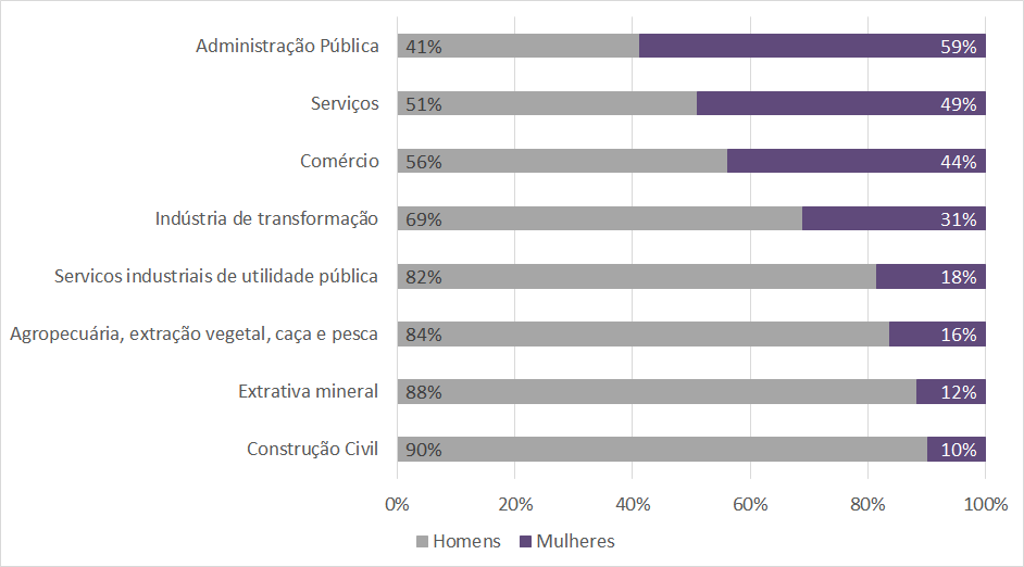 Para os autores desse artigo, que abre as discussões, as implicações substanciais para a igualdade de gênero não se darão apenas durante a crise, mas também durante a fase de recuperação posterior à pandemia. Essa crise apresentaria um diferencial porque, ao contrário de outras recessões econômicas, que tendem a afetar os empregos dos homens, como ocorreu na I e II Guerras Mundiais, esse novo cenário afeta os setores com alta participação no emprego feminino. De fato, essa mesma tendência já pode ser observada no Brasil. O Gráfico 2 apresenta a participação feminina e masculina em cada setor de atividade no Brasil, nos vínculos de trabalho formal.