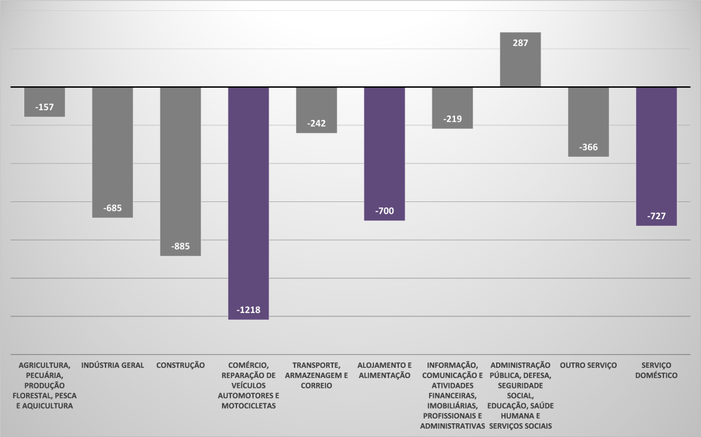 A participação feminina só é maior que a masculina na administração pública. A segunda maior participação feminina é no setor de serviços, representando 49% dos vínculos formais, e a terceira maior participação é no setor de comércio, com 44% de composição feminina. De acordo com os recentes dados divulgados pelo IBGE, referentes à Pesquisa Nacional por Amostra de Domicílios Mensal (PNADM), ao compararmos a média trimestral de fev/mar/abr 2020 com a de nov/dez/jan 2020, no país houve uma queda de 4,9 milhões de postos de trabalho,  como consequência da crise econômica e política que se arrasta desde de 2015 e do contexto epidemiológico mundial, com a pandemia da Covid-19. De acordo com o Gráfico 3, a maior redução de postos de trabalho, em termos absolutos, foi no setor de comércio (1,2 milhão de postos), seguido pela construção (885 mil postos), serviço doméstico (727 mil postos) e alojamento e alimentação (700 mil postos).