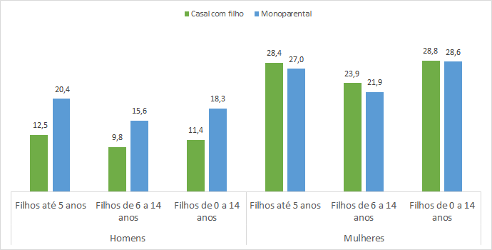 Essa é a carga de trabalho doméstico com a qual as famílias já estavam lidando antes da pandemia. Qualquer que seja a composição familiar, o tempo dedicado pelas mulheres é sempre maior. Entretanto, enquanto os homens passam a fazer mais trabalho doméstico quando estão em arranjos monoparentais, nesse contexto as mulheres fazem menos trabalho, já que parte do trabalho feito pelas mulheres é direcionado também aos parceiros. Em um domicílio do tipo casal com filho, com criança(s) de até 5 anos, as mulheres dedicam, em média, por semana, 28 horas e 40 minutos ao cuidado da casa e dos filhos. Se os filhos estão na idade escolar, a carga de trabalho doméstico observada é de 23 horas e 54 minutos em média por semana. No domicílio com mãe e filhos que estejam em idade escolar, a jornada deste trabalho é de 21 horas e 54 minutos. Nesses domicílios, o aumento no trabalho doméstico é esperado com a suspensão das aulas.