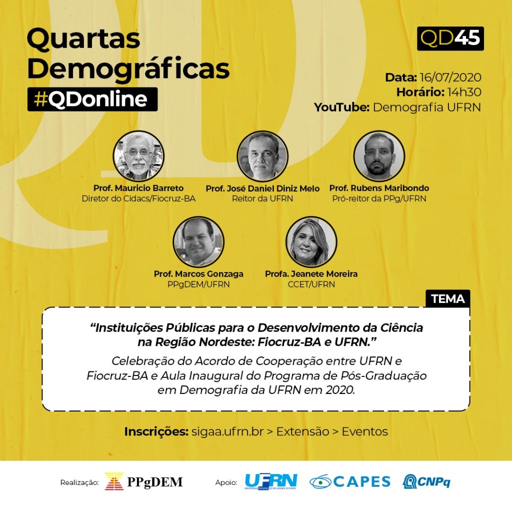 O Programa de Pós-graduação em Demografia tem a satisfação em convidá-l@s para participar da 45ª edição das Quartas Demográficas e também a aula inaugural 2020 do PPGDEM, que ocorrerá no dia 16/07/2020, às 14h30, através do canal do youtube do PPGDem. Já é possível entrar no canal e nele se inscrever. Clique também, no sino de notificações para receber um aviso momentos antes do início do evento.