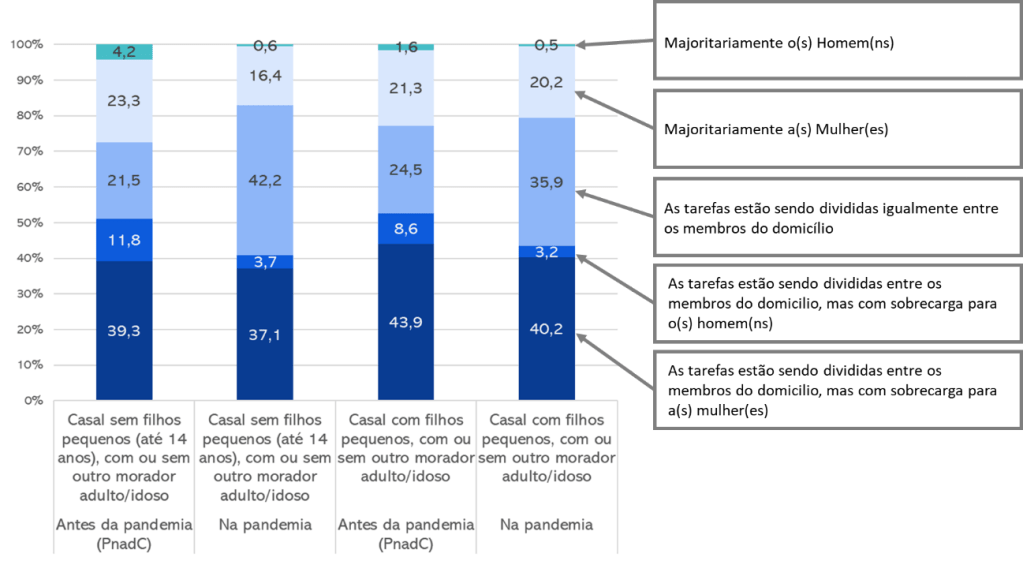Ainda que a distribuição mais igualitária das tarefas domésticas tenha aumentado, essa mudança foi mais perceptível entre os casais sem filhos do que entre os casais com filhos pequenos. A presença de crianças aumenta a quantidade de trabalho doméstico. No contexto da classe média, várias escolas adotaram a modalidade de ensino à distância, que demanda participação dos adultos quanto menor é a idade da criança. Portanto, ainda que 35,9% dos casais com filhos venham dividindo as tarefas de forma mais igualitária, não necessariamente o nível de trabalho doméstico das mães diminuiu.