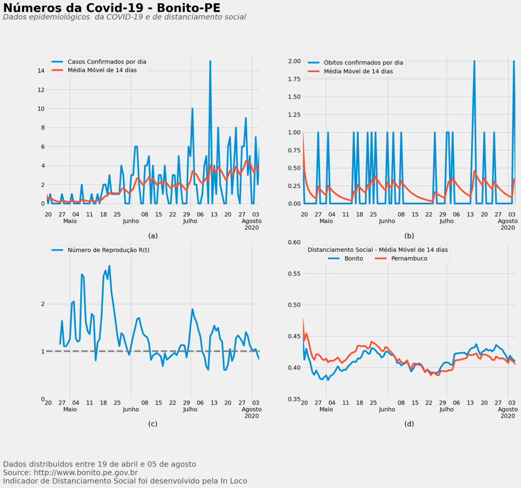 A Figura 1(a) representa os números de casos confirmados de COVID-19 por dia e sua respectiva tendência; a Figura 1(b) refere-se a quantidade de óbitos por COVID-19 confirmados por dia e a tendência apresentada; a Figura 1(c) apresenta a estimativa do número de reprodução (R(t)); e por fim, a Figura 1(d) apresenta a evolução do indicador de isolamento social da InLoco para esse município em comparação com o estado de Pernambuco. Esse indicador representa o percentual da população que permaneceram em suas casas. Os dados são diários e se referem ao período de 19 de abril (dia do primeiro caso confirmado em Bonito) a 05 de agosto.