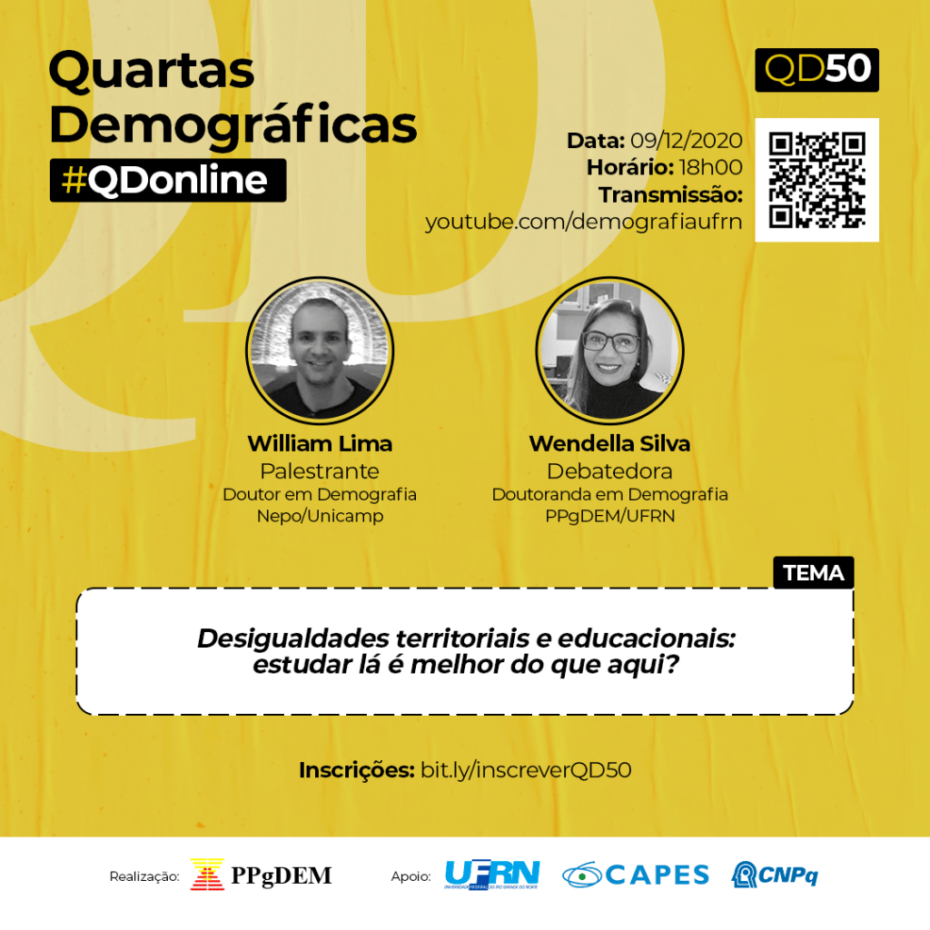 QD50 Online | 09.12.2020 | “Desigualdades territoriais e educacionais: estudar lá é melhor do que aqui? | William Lima (doutor em demografia, Nepo/Unicamp, egresso do mestrado do PPGDem) | 18h00 | Youtube/demografiaUFRN