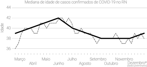Os dados disponibilizados pela SESAP-RN indicam uma retomada do crescimento da epidemia de Covid-19 no Rio Grande do Norte a partir do final de agosto, e com aceleração desse ritmo de aumento nos meses subsequentes. Conforme mostra a Recomendação No. 21 do Comitê de Especialistas da SESAP-RN, chama a atenção nesse cenário o perfil etário da curva de contaminados no estado: se no início da pandemia, em março, a população jovem de 35 anos ou menos respondia por 27,8% do total de casos de Covid-19, em novembro, a participação desse mesmo grupo etário era de quase a metade do total de registros (46,5%) [2]. Nesta nova fase da epidemia, o perfil dos infectados é quatro anos mais jovem, se comparado com o pico da epidemia em Junho deste ano (mediana, 42 e 38 anos, respectivamente em Junho e Dezembro), conforme mostra a Figura 1.