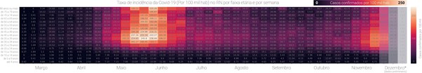 Até junho as taxas de incidência da Covid-19 por grupo etário se mantinham crescentes, se reduzindo a partir de julho, e com certa homogeneidade entre eles (predomínio de cores mais escuras). Porém, alguns meses depois, por volta de novembro, este equilíbrio é rompido, com alguns grupos apresentando maior risco de contrair Covid-19 do que outros, como os adultos jovens de 25 a 40 anos. Na última semana de novembro observa-se que as taxas de incidência de Covid-19 nas faixas etárias de 60 a 64 anos e de 70 a 74 anos, por exemplo, voltaram a se destacar, tal como observado cinco meses atrás (representados por cores mais claras).