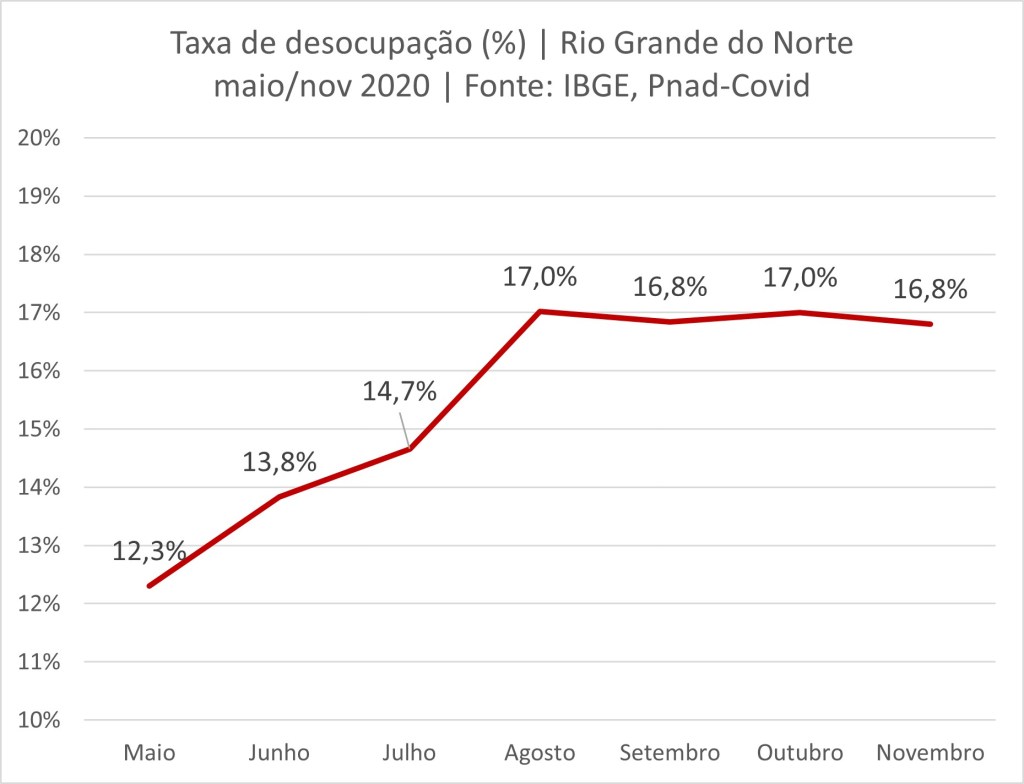 A desocupação é medida a partir da informação da população em idade ativa que declara que estavam procurando emprego na semana de referência da pesquisa. A Taxa de Desocupação (desemprego) para o Rio Grande do Norte que era de 12,3% em maio, passou para 16,8% em novembro. Em torno de 50% dos que não procuraram emprego gostariam de ter trabalhado e cerca de 40% não procuraram emprego por conta da pandemia, por problemas de saúde ou por ausência de oportunidades de trabalho. Dados que alertam que as condições da pandemia ainda persistem. E, embora os indicadores do Cadastro Geral de Empregados e Desempregados (CAGED, Ministério da Economia) sobre a geração de novos postos de trabalho bata recordes, trata-se ainda de recuperação dos empregos perdidos nos primeiros meses da pandemia o que acaba não refletindo necessariamente na taxa de desemprego.