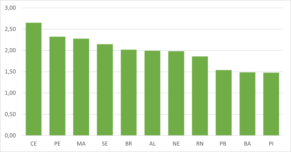De acordo com o Gráfico 1, as Unidades da Federação nordestinas que apresentaram os maiores ganhos na expectativa de vida ao nascer com a exclusão da SRAG foram Ceará, Pernambuco e Maranhão, com ganhos de 2,65, 2,33 e 2,28 anos, respectivamente. Isso quer dizer que se fossem excluídos os óbitos por SRAG de 2020 no Ceará, por exemplo, a expectativa de vida poderia ser 2,65 anos maior. O Rio Grande do Norte, com 1,86 anos, se encontra em posição intermediária e apresenta uma diferença de anos ganhos pela exclusão da SRAG que está abaixo da média do Brasil e, no Nordeste, perde apenas para Paraíba, Bahia e Piaui.
