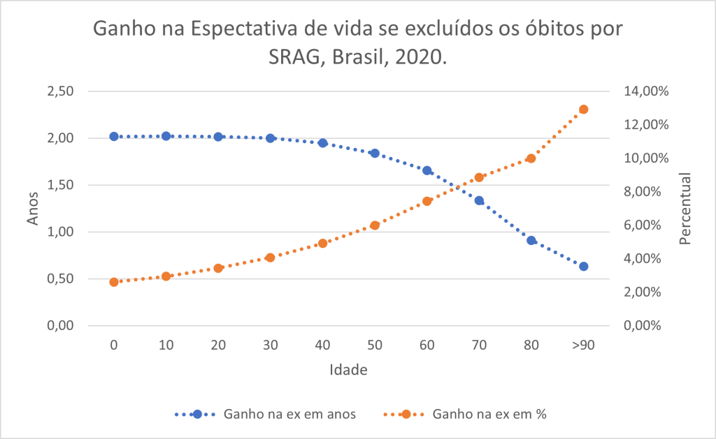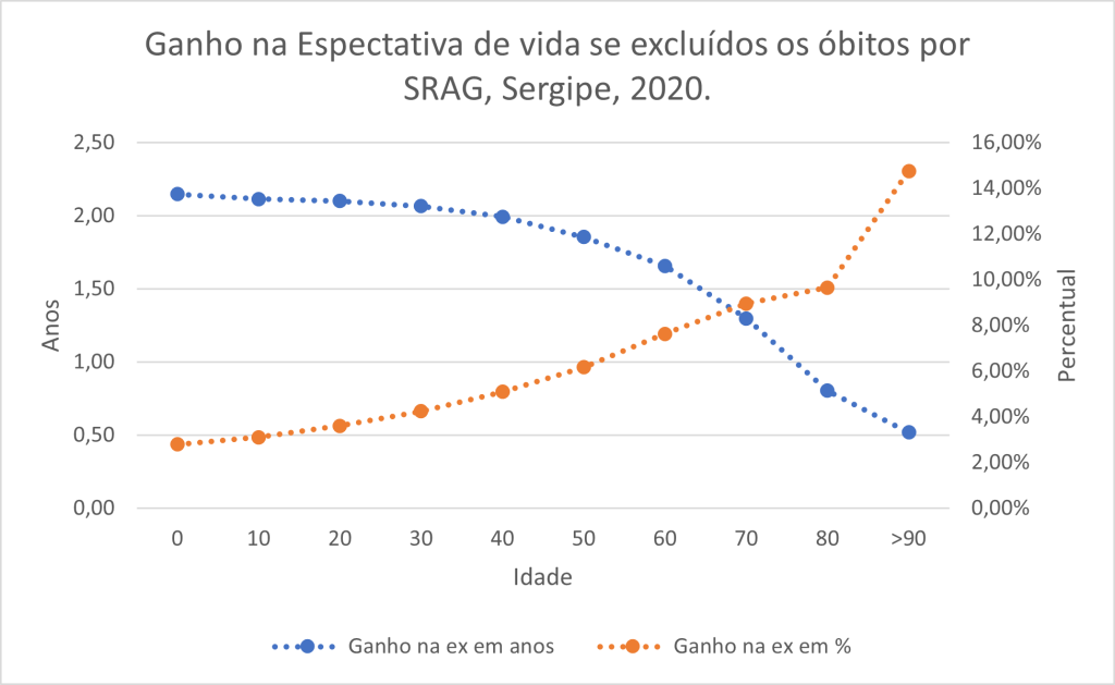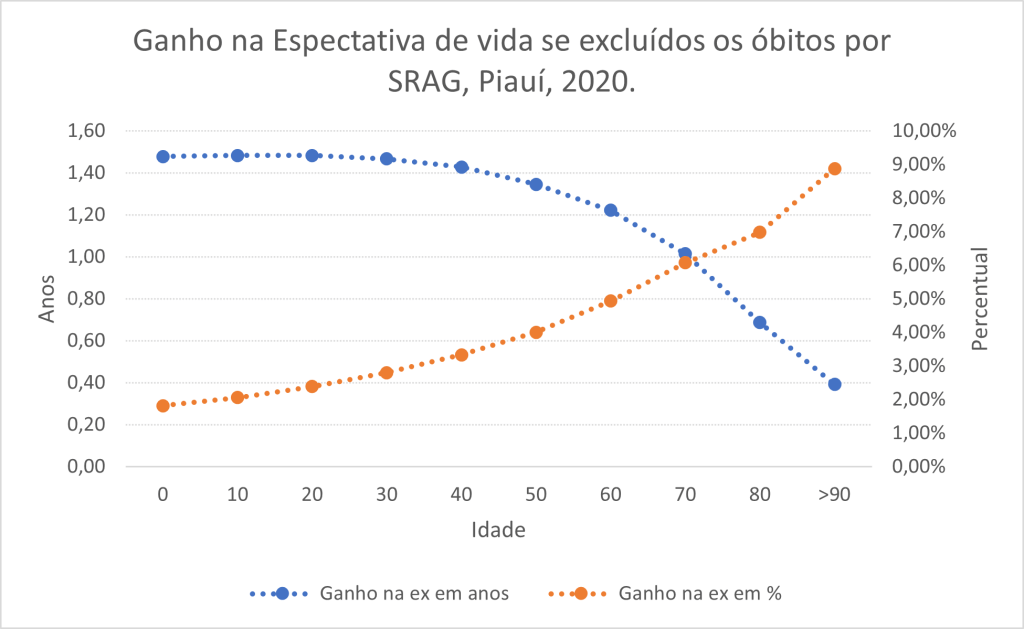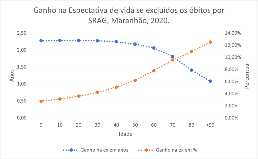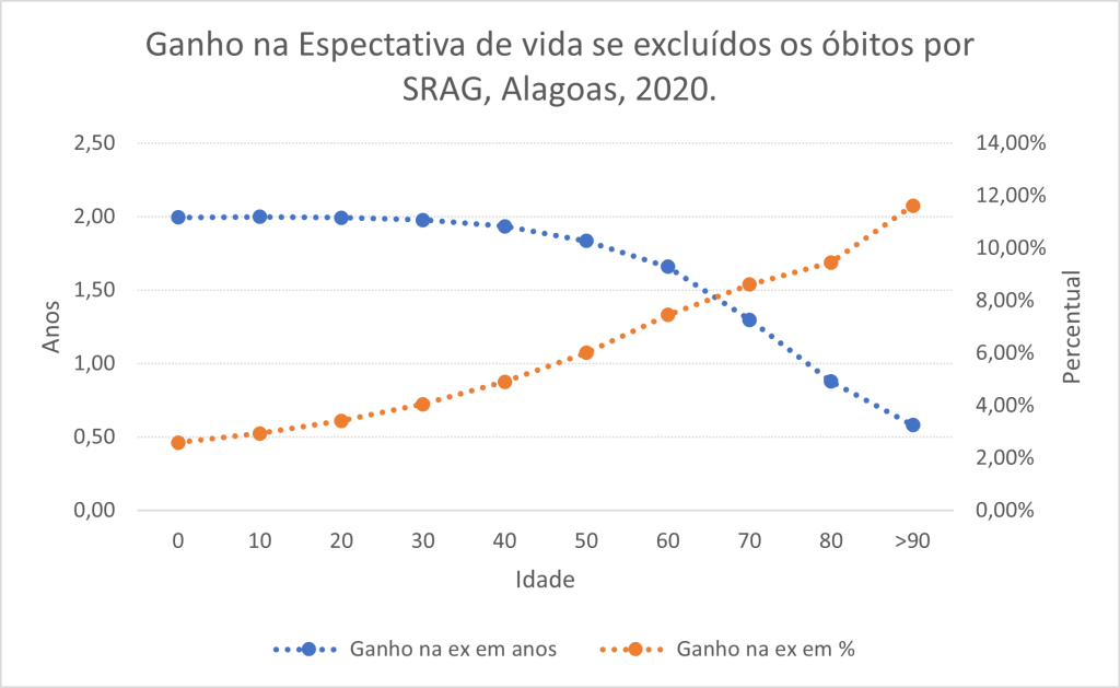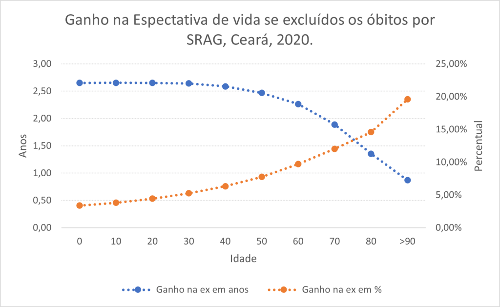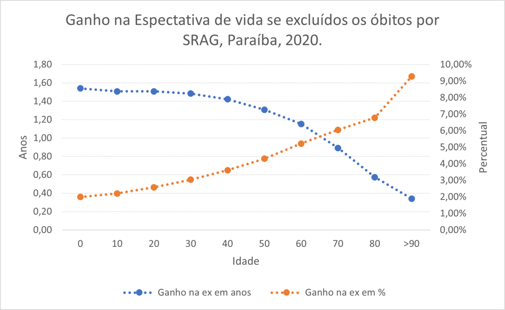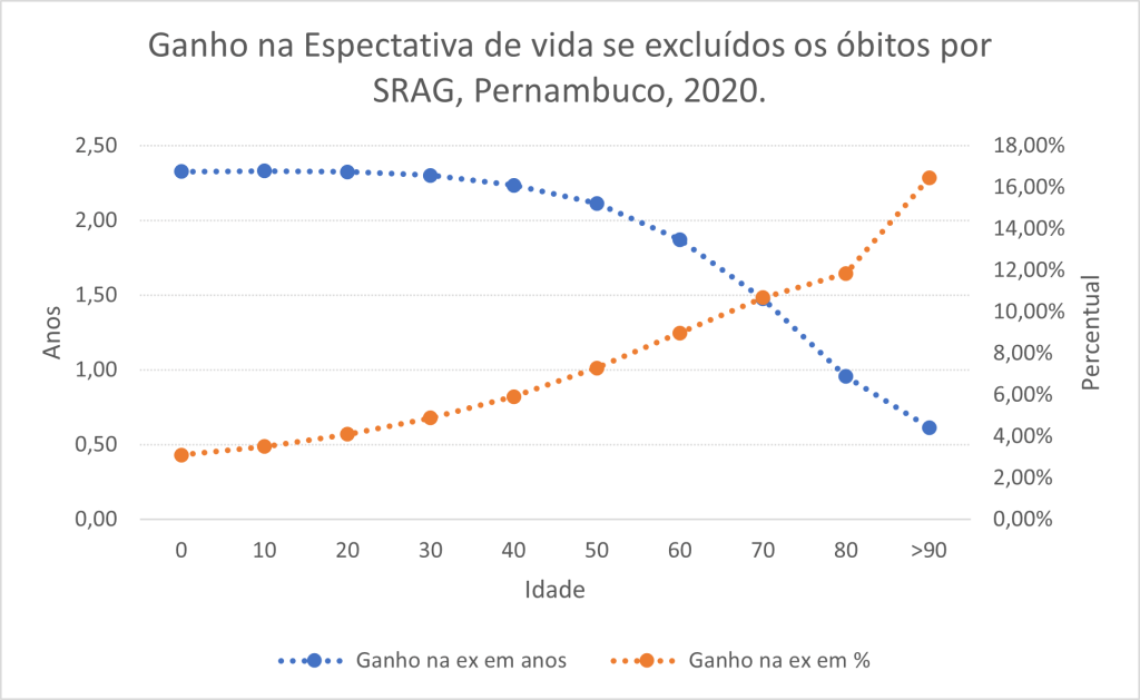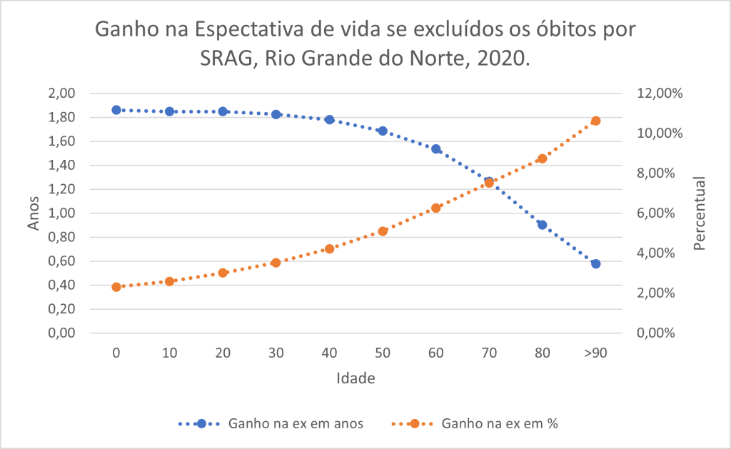 No caso do RN, as pessoas com 60 anos de idade teriam ganho 6,3% de tempo de vida com a exclusão da SRAG. Ou seja, para uma pessoa que tivesse chegado aos 60 anos de idade em 2020 no Rio Grande do Norte era esperado que ela vivesse até os 86 anos se pudéssemos ter excluído todas as mortes por SRAG, mas como isso não ocorreu, a expectativa de vida à idade exata de 60 anos no RN em 2020 cairia para 84,5 anos. Portanto, a SRAG contribuiu com uma perda de um ano e meio na vida do potiguar que tinha 60 anos em 2020.