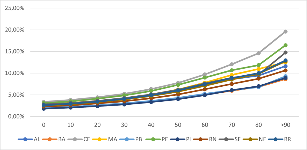 Embora o indicador mais usado seja a expectativa de vida ao nascer, é possível estimar a expectativa de vida para todas as idades exatas das pessoas. Ou seja, muitas vezes confundimos o termo “expectativa de vida” com a sua expressão mais comum que seria a “expectativa de vida à idade exata de zero anos (ao nascer)”. No quadro geral, o Brasil apresentou um ganho com a exclusão da SRAG de 2,6% no valor da expectativa de vida ao nascer, enquanto o NE, 2,53%. Mas ao verificarmos esse ganho na expectativa de vida em cada idade, nota-se que esse ganho é decrescente, o que já é esperado. No entanto, se consideramos o ganho proporcional na expectativa de vida em cada idade, verifica-se que os maiores ganhos percentuais ocorrem nas idades mais avançadas, conforme Gráfico 2. Percebe-se, por exemplo, que seria de quase 10% o ganho na expectativa de sobrevida da população com a idade de 60 anos no estado do Ceará se excluíssemos as mortes por SRAG.
