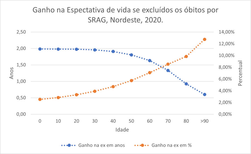 Em termos proporcionais, os maiores ganhos com a exclusão da SRAG em termos de anos da expectativa de vida seriam nas idades mais avançadas. Isso se deve ao fato de que os grupos de maior risco para o desenvolvimento de quadros graves da Covid-19 serem entre os mais idosos. Os gráficos com os ganhos proporcionais e em anos para cada idade para as UFs do Nordeste estão disponíveis ao final do texto.