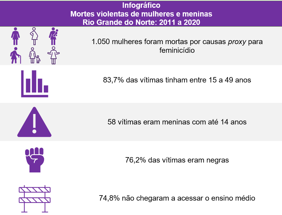 O cenário de violência contra as mulheres potiguares é alarmante: segundo dados da Rede e Instituto Observatório da Violência do Rio Grande do Norte (OBVIO), entre 2011 e 2020, em média, a cada três dias uma mulher foi vítima de morte violenta no estado. Entre as causas, estão: feminicídio, homicídio doloso, lesão corporal seguida de morte, latrocínio e intervenção policial. Para alguns pesquisadores, a maioria das mortes de mulheres e meninas podem ser consideradas uma proxy para o feminicídio, pois ocorrem também como um crime de ódio contra as mulheres. No total, ao longo desses anos, foram 1.050 vidas de mulheres perdidas por causas totalmente evitáveis. A observação da série história de mortes violentas de mulheres no estado permite algumas conclusões. Sabe-se 83,7% das vítimas tinham idade entre 15 e 49. Embora menos frequente, as mortes violentas de meninas também ocorreram: em 10 anos, foram 58 mortes de meninas de até 14 anos. Embora as mulheres negras representem 56,4%, elas foram alvo em 76,2% dos casos de mortes violentas. Além disso, nota-se a falta de oportunidades associada ao risco de violência: 74,8% das mulheres mortas de forma violenta no estado não chegaram sequer a acessar o ensino médio.