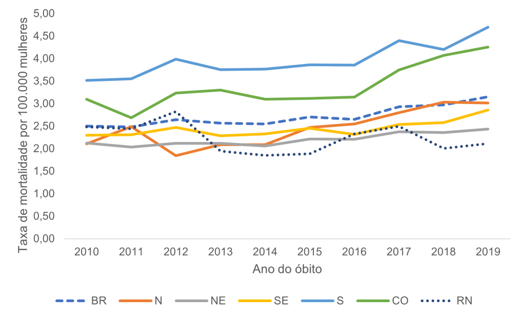 As maiores taxas de mortalidade foram observadas em mulheres nas faixas etárias de 40 a 69 anos (Gráfico 1), e nas regiões Sul e Centro- Oeste em todos os anos estudados, sugerindo aumento das taxas de mortalidade ao longo dos anos (Gráfico 2). Esses dados corroboram o aumento nas taxas de suicídio na população geral nessas duas regiões, que demonstram ascendência ao longo das últimas décadas de estudos.