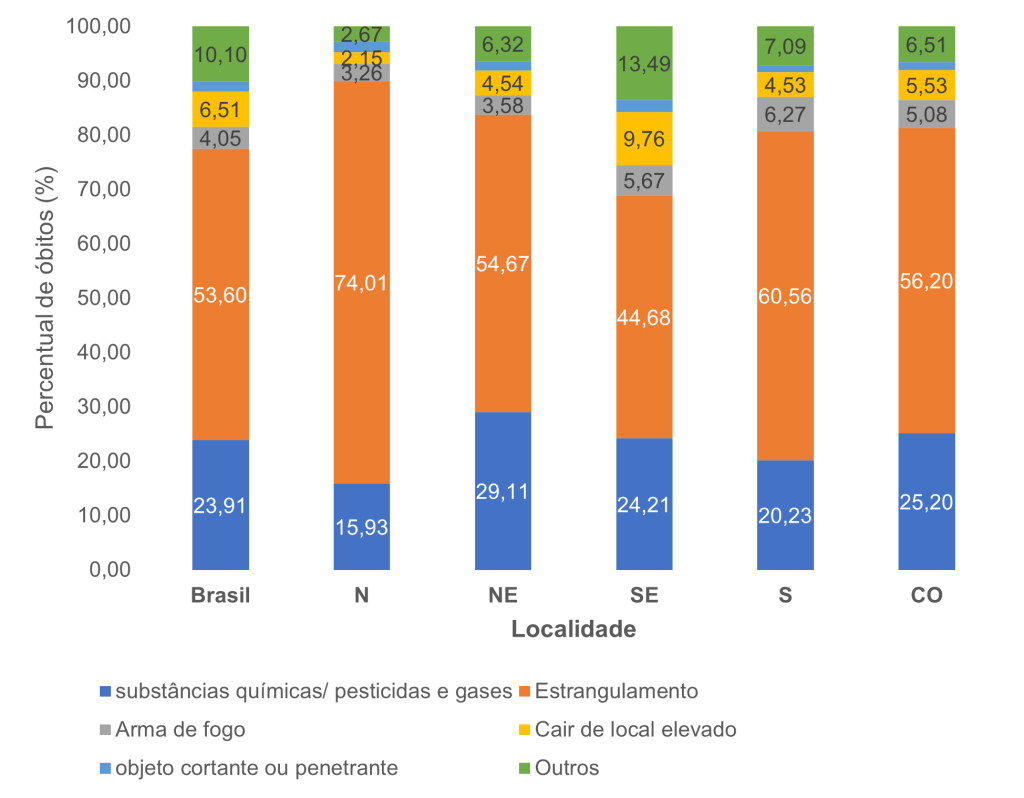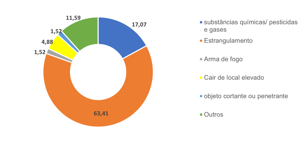 O local de ocorrência do suicídio de maior frequência em todas as regiões e no estado do RN foi o domicílio, e tiveram como principal meio de perpetração o estrangulamento e o uso de substâncias químicas (medicamentos e pesticidas) (Gráficos 3, 4 e 5).