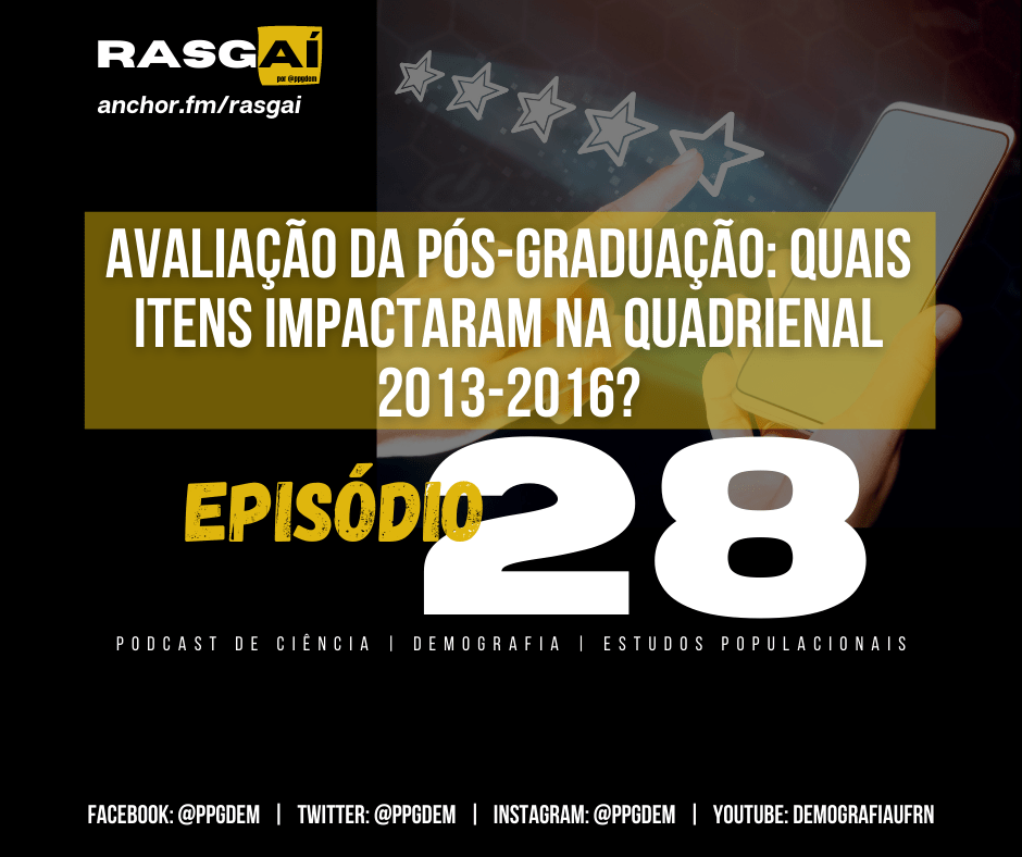 O episódio #28 do Rasgaí conversou com o professor e pesquisador da Escola Nacional de Ciências Estatísticas (ENCE/IBGE), o demógrafo Cesar Augusto Marques. Ele desenvolveu, junto a outras pesquisadoras, um estudo (acesse aqui) analisando os dados do ciclo de avaliação de 2013 a 2016 da pós-graduação brasileira. É importante ressaltar que os critérios de avaliação usados no ciclo 2013-2016 são substancialmente diferentes do atual, que avaliará o ciclo 2017-2020. Entre outras mudanças, por exemplo, a ficha que avaliava antes 5 dimensões, agora será baseada em 3 dimensões e os critérios buscam tornar a avaliação mais qualitativa na direção de valorizar os impactos e contribuições da produção científica dos programas de pós-graduação. Mesmo assim, é importante entender os processos passados para analisar o atual e o futuro.