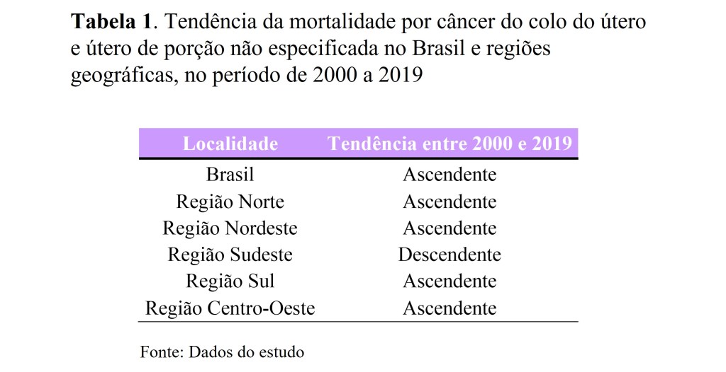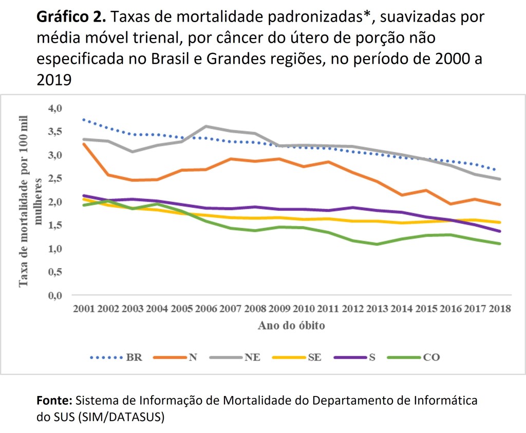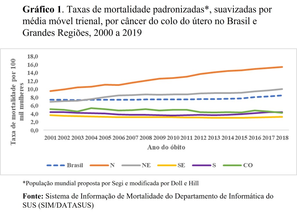 No período de 2000 a 2019, em mulheres com 20 ou mais anos, observou-se, em média, mais de 7 óbitos por câncer de colo do útero a cada 100 mil mulheres (taxa média padronizada de 7,7 óbitos a cada 100 mil mulheres) As maiores taxas de mortalidade foram observadas nas regiões Norte (15,8 óbitos por 100 mil mulheres) e Nordeste (8,6 óbitos por 100 mil mulheres), e as menores no Sudeste (3,2 óbitos por 100 mil mulheres) e Sul (3,9 óbitos por 100 mil mulheres). Esses níveis e diferenciais permaneceram em todo o período estudado (Figura 1). Esses não são resultados inesperados, pois nas regiões Norte e Nordeste o câncer do colo do útero aparece como a segunda neoplasia mais incidente nas mulheres, quando se excluí o câncer de pele não melanoma, representando 20,6% dos cânceres diagnosticados em 2020 na região Norte e 10,9% na região Nordeste .
