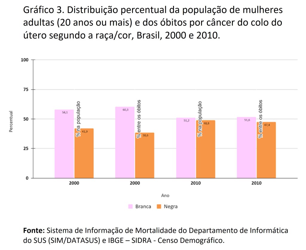 Esses resultados, conjuntamente com um olhar sobre a realidade socioeconômica brasileira, demonstram que a mortalidade mais incidente em mulheres negras não se justifica por questões étnicas e raciais, mas pela manutenção de dificuldade de acesso aos meios diagnósticos e terapêuticos que estas mulheres enfrentam, promovendo mais diagnóstico em estágio avançado da doença e menor sobrevida quando comparadas às mulheres brancas.