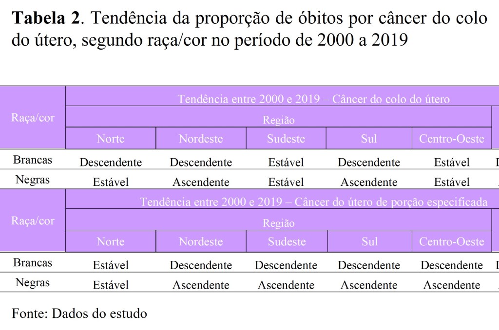 Além disso, chama-nos a atenção que, durante o período de 2000 a 2019, enquanto houve redução na proporção (%) de óbitos por câncer do colo do útero em mulheres brancas no Brasil e nas regiões Nordeste e Sul, houve aumento da proporção de óbitos em mulheres negras. Quanto ao câncer do útero de porção não especificada verificou-se elevação nas proporções em mulheres negras no Brasil e em todas as regiões geográficas, com exceção da Norte em que foi estável (Tabela 2). Destaca-se que o câncer do útero de porção não especificada sinaliza para limites no acesso aos serviços de saúde, pois o câncer é diagnosticado em fase avançada não podendo identificar se a doença aconteceu no colo ou corpo do útero (endométrio), e mesmo havendo redução nas taxas de mortalidade por câncer do corpo do útero em todas as regiões brasileiras, ao discriminar por raça/cor em todos os períodos e localidades há maior proporção em mulheres negras.