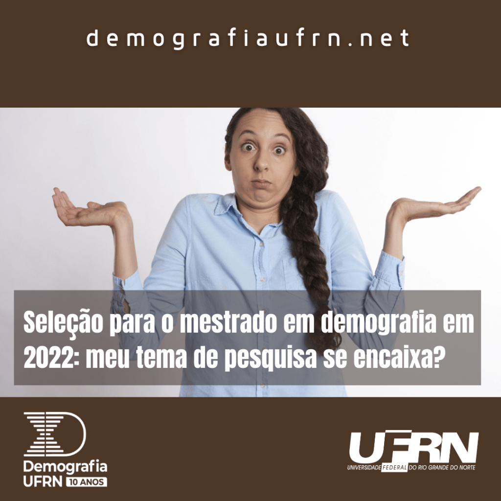 O Programa de Pós-Graduação em Demografia da UFRN está com edital aberto com 8 vagas para o mestrado para início em 2022. Mas será que meu tema de pesquisa se encaixa na área de demografia? Que temas de pesquisa podem ser desenvolvidos num mestrado em demografia?