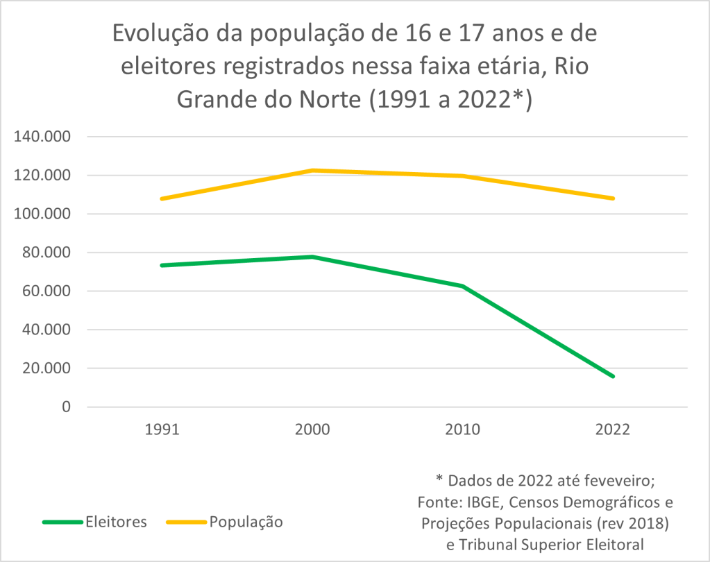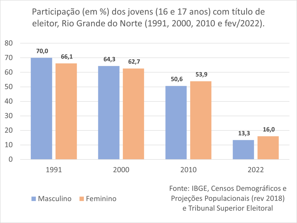 Em outros termos, podemos analisar essa evolução em termos de cobertura da população facultada a votar exercendo seu direito. Em 1991, logo após a conquista do voto facultativo por esse público, a participação era de cerca de 70% no RN e caiu para cerca de 50% em 2010. Mas o que de fato preocupa é que até fevereiro de 2022, a participação de registros eleitorais de jovens entre 16 e 17 anos no RN era de apenas 13% para jovens de sexo masculino e 16% entre as do sexo feminino. Essa participação dos jovens facultados à votar é, até o momento, a mais baixa da história no Rio Grande do Norte (acompanhando a tendência nacional). Ou seja, a redução da quantidade de pessoas nesses grupos de idade decorrente da transição demográfica não é suficiente para explicar a queda da participação dos jovens.