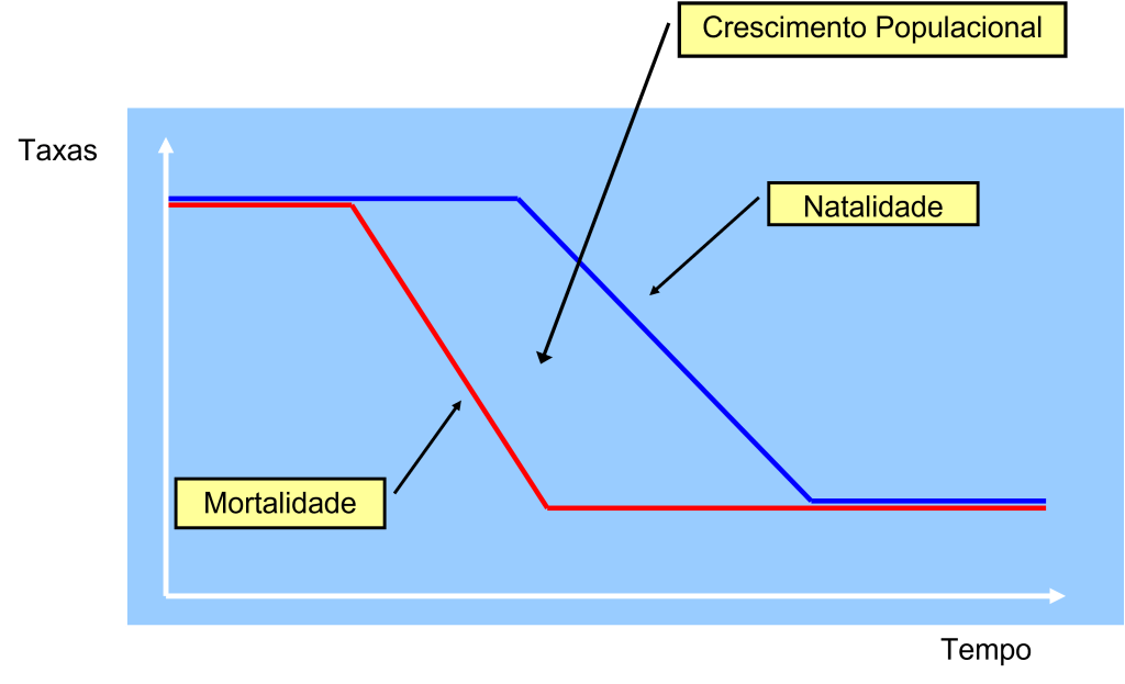 Ao longo dos últimos anos a tendência da transição demográfica vem consolidando uma mudança na estrutura etária da população no país e isso também ocorre no Rio Grande do Norte. A transição demográfica é a passagem de um equilíbrio de elevadas taxas de natalidade e mortalidade para um segundo momento em que essas taxas caem e se estabilizam novamente em patamares mais baixos, como representadas no gráfico abaixo. Nesse processo, ocorre primeiro uma queda nas taxas de mortalidade e, posteriormente, a queda das taxas de natalidade. E é por isso que nesse período em que a natalidade ainda não caiu a ponto de retomar o equilíbrio com as taxas de mortalidade é que experimentamos no Brasil (assim como em outros países) um crescimento populacional elevado.