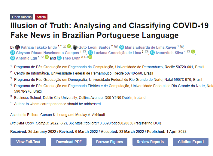 O artigo é uma coautoria dos pesquisadores Patricia Takako Endo, Guto Leoni Santos, Maria Eduarda de Lima Xavier, Gleyson Rhuan Nascimento Campos, Luciana Conceição de Lima, Ivanovitch Silva, Antonia Egli e Theo Lynn e foi publicada no periódico científico Big Data and Cognitive Computing e pode ser acessado através do link: https://www.mdpi.com/2504-2289/6/2/36.