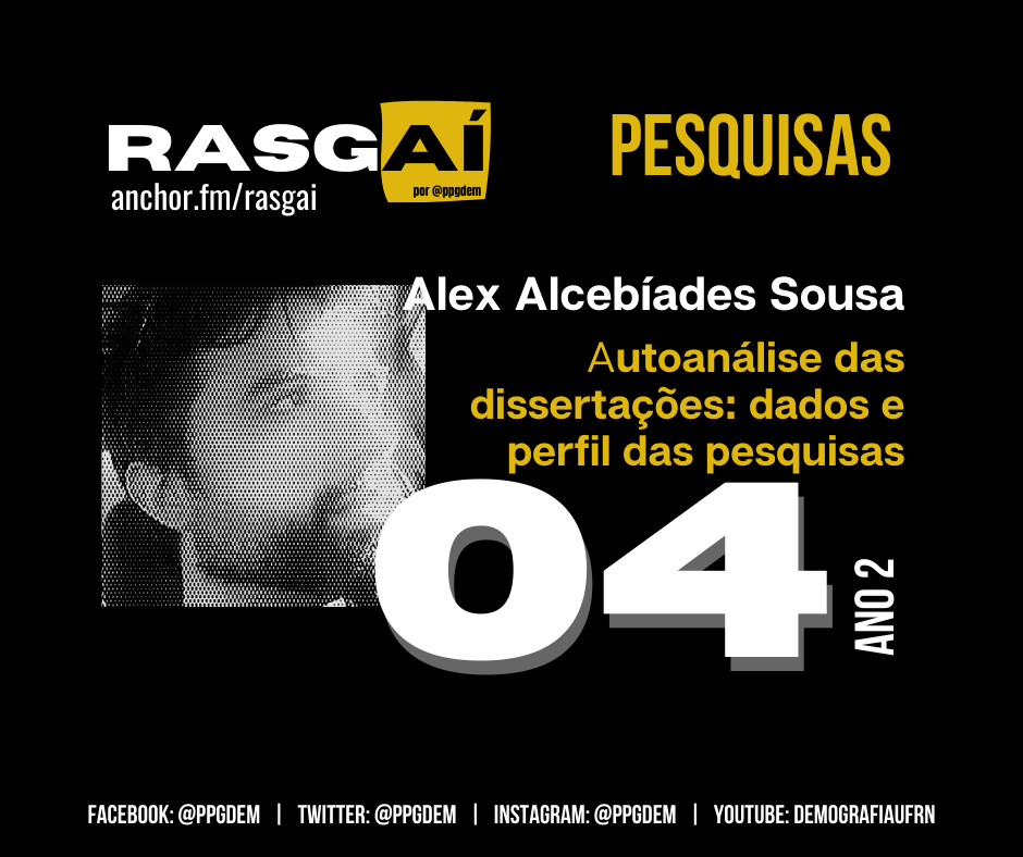 A conversa de hoje é sobre a pesquisa do Alex Alcebíades Souza, que defendeu sua dissertação de mestrado em 2021 com o título: “Relações entre dados e estudos populacionais no Brasil: um estudo de caso do PPGDEM, de 2013 a 2020”. A pesquisa fez uma investigação de autoanálise, uma análise crítica da produção acumulada de dissertações defendidas no PPGDem nos seus primeiros anos. Embora, o mestrado tenha iniciado suas atividades em 2011, o início do período analisado foi 2013, pois o mestrado dura 2 anos e as primeiras titulações ocorreram em 2013. O Alex analisou dados das 72 dissertações defendidas nesse período em termos das características dos discentes-pesquisadores e dos seus trabalhos. O que os resultados mostram a partir do banco de dados organizado pelo Alex é a convergência das pesquisas na direção da missão institucional e social do PPGDem. Além disso, joga luz sobre o perfil diversificado dos discentes e egressos aqui formados.