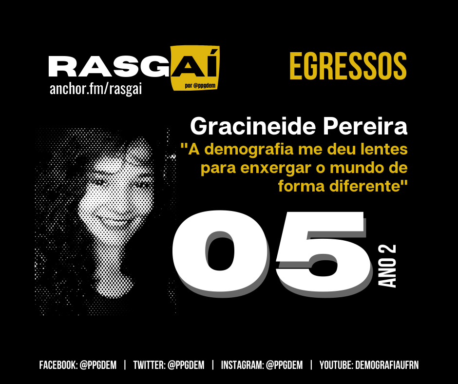 No episódio de hoje, conversamos com uma egressa que também é da primeira turma e que defendeu sua dissertação de mestrado em 2013. A convidada do Rasgaí é Gracineide Pereira que desenvolveu a pesquisa intitulada “Afinal, quantos éramos? Um estudo da mortalidade pretérita na Freguesia da Gloriosa Sant’Anna” usando dados populacionais do século 19. Historiadora formada pela UFRN, depois de concluir seu mestrado no PPGDem, seguiu para Portugal para desenvolver pesquisa de doutorado (com bolsa da Capes) na Universidade do Minho, que é referência na pesquisa sobre demografia histórica e história da população. Gracineide falou sobre os desafios de sair da zona de conforto, como essas dificuldades foram enfrentadas e como foi importante esse aprendizado para a sua formação pessoal e profissional. Ela falou também como essa trajetória no nosso mestrado ajudou na sua passagem pelo doutorado em Portugal e como ajuda ela até hoje.