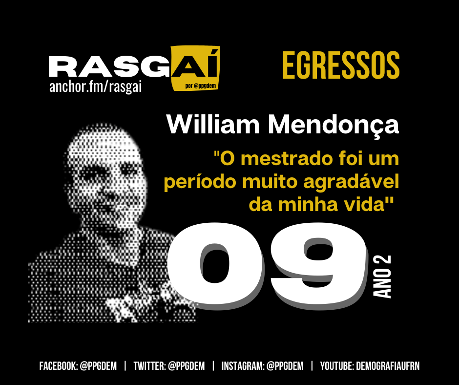 No episódio 9 da segunda temporada do Rasgaí, conversamos com o William Mendonça de Lima que concluiu seu mestrado em 2015 aqui na Pós-Graduação em Demografia da UFRN e depois seguiu e já concluiu o doutorado também em demografia na Universidade Estadual de Campinas (Unicamp). Ele contou pra gente como foi a sua experiência e nos deu um exemplo de como podemos ajustar qualidade e rigor na produção científica e acadêmica sem necessariamente sermos reféns dessa cobrança. Para ele, o mestrado foi um período agradável da vida. Vem saber mais como foi a conversa!