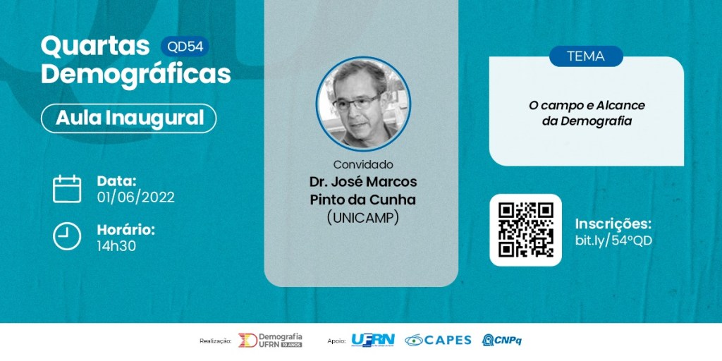 A 54a edição das Quartas Demográficas, ciclo de seminários do Programa de Pós-Graduação em Demografia, contará com a presença do professor Dr. José Marcos Pinto da Cunha. A palestra “O campo e alcance da Demografia” ocorrerá no dia 01/06 (quarta-feira) às 14h30 no Anfiteatro “A” do Centro de Ciências Exatas de da Terra (CCET). Retomando as edições presenciais após mais de dois anos, a QD54 também faz alusão ao início do semestre letivo sendo, portanto, a aula inaugural do PPGDem em 2022.1.