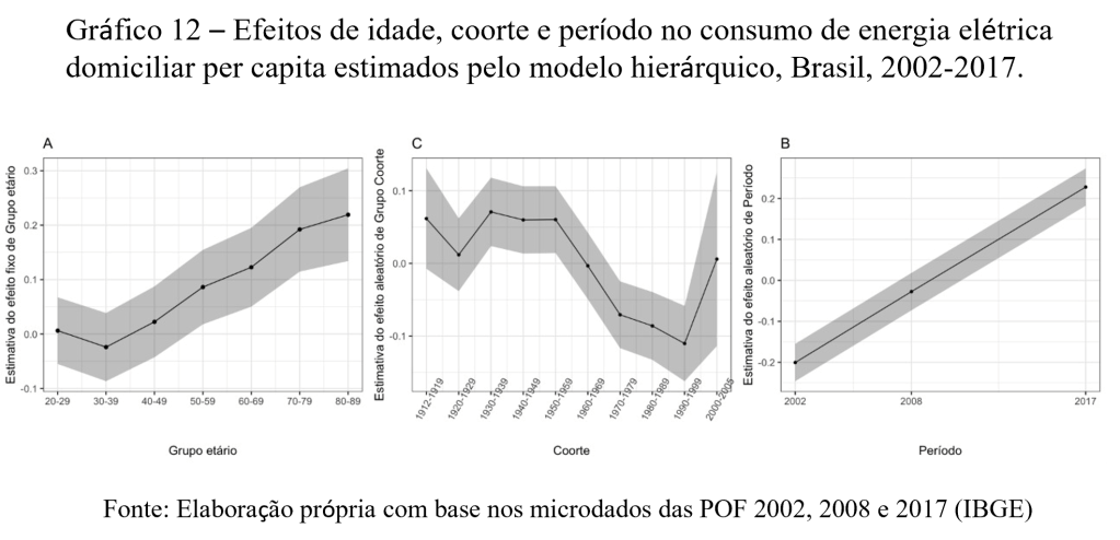 Na tese de doutorado, Victor detalhou essa análise, pois apesar de haver clara evolução do consumo de energia conforme o domicílio envelhece, há efeitos que decorrem do período da análise e também da coorte de nascimentos dos indivíduos. Ou seja, os domicílios mais envelhecidos consomem mais energia elétrica, mas isso pode ser contaminado pelo momento histórico (efeito de período) e também das características inerentes às gerações de nascimento dos indivíduos (efeitos de coorte). Assim, os modelos de Idade-Período-Coorte contribuem para entender esses efeitos concorrentes. A pesquisa avaliou 15 modelos com diferentes pressupostos e controle de variáveis para testar as convergências e observar os comportamentos da relação.